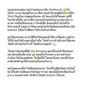 “สรุปว่าผลออกมาเป็น Positive ค่ะ ไม่เป็นไร covid มันอยู่กับเรามาตั้งนานแล้วก็จะขอสู้ต่อไปจากนี้อีก 10 กว่าวันแล้วมารอดูผลกันนะคะ ตัวโยเองไม่ได้โทษสถานที่ที่ไหนใดๆทั้งสิ้น เพราะเชื่อว่าทุกคนก็เจอหนักหนามาพอๆกัน เราคาดการณ์ไม่ได้หรอกคะว่าใครมีเชื้อ ยิ่งตอนนี้เจ้าโควิดก็ไปทักทายทุกที่ แต่อยากให้ทุกๆคนช่วยกันรับผิดชอบต่อสังคม เปิด timeline ให้คนใกล้ชิดเราได้ระวังตัวเท่านั้นค่ะ