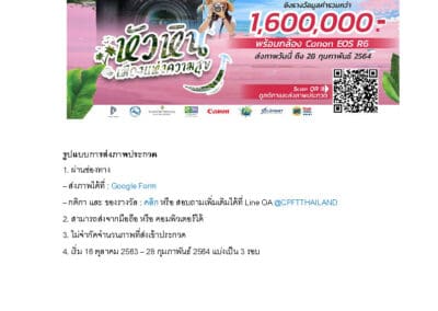 รูปแบบการส่งภาพประกวด 1. ผ่านช่องทาง – ส่งภาพได้ที่ : Google Form – กติกา และ ของรางวัล : คลิก หรือ สอบถามเพิ่มเติมได้ที่ Line OA @CPFTTHAILAND 2. สามารถส่งจากมือถือ หรือ คอมพิวเตอร์ได้ 3. ไม่จากัดจานวนภาพที่ส่งเข้าประกวด 4. เริ่ม 16 ตุลาคม 2563 – 28 กุมภาพันธ์ 2564 แบ่งเป็น 3 รอบ