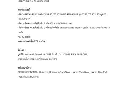 การตัดสินรางวัลใหญ่ Final *** การตัดสินภาพรอบที่ 3 ทางผู้จัดการประกวดจะนาเอาภาพที่ได้รับรางวัลชมเชยรวม 90 ภาพ จากการตัดสินรอบที่ 1 และ 2 มารวมกับภาพที่ได้รับรางวัลในรอบที่ 3 เพื่อตัดสินรางวัลชนะเลิศ รางวัลรองชนะเลิศอันดับ 1 และ รองชนะเลิศอันดับสอง – ประกาศผลรวม 20 มีนาคม 2564 รางวัลมีดังนี้ – โล่รางวัลชนะเลิศ พร้อมเงินรางวัล 40,000 บาท และกล้องดิจิตตอล มูลค่า 89,500 บาท รวมมูลค่า 129,500 บาท – โล่รางวัลรองชนะเลิศอันดับ 1 พร้อมเงินรางวัล 20,000 บาท – โล่รางวัลรองชนะเลิศอันดับ 2 พร้อมบัตรที่พัก Intercontinental Huahin มูลค่า 12,000 บาท จานวน 10 รางวัล รวม 12 รางวัล รวมรางวัลทั้งสิ้น 672 รางวัล จัดโดย : มูลนิธิภาพถ่ายแห่งประเทศไทย CPFT ร่วมกับ CAL-COMP, PROUD GROUP, การท่องเที่ยวแห่งประเทศไทย และ CANON สนับสนุนโดย : INTERCONTINENTAL HUA HIN, HolidayI In VanaNava HuaHin, VanaNava HuaHin, Blue Port, True ARENA HUA HIN