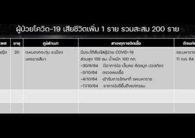 นครราชสีมา-วันนี้ (12 ตุลาคม 2564) ที่ศูนย์โควิด 19 โคราช สำนักงานสาธารณสุขจังหวัดนครราชสีมา รายงานสถานการณ์การแพร่ระบาดของโรคติดเชื้อโควิด 19 ในพื้นที่จังหวัดฯ ว่า พบผู้ติดเชื้อรายใหม่ 153 ราย เป็นการติดเชื้อกันเองในพื้นที่จังหวัด 151 รายและติดจากนอกจังหวัด 2 ราย ทำให้มียอดผู้ป่วยติดเชื้อสะสม 27,679 ราย โดยรักษาหายแล้ว 24,551 ราย ยังรักษาอยู่ 2,928 ราย โดยมีรายงานผู้เสียชีวิตเพิ่มอีก 1 ราย ทำให้มียอดเสียชีวิตสะสม อยู่ที่ 200 ราย ซึ่งผู้เสียชีวิตรายล่าสุด เป็นผู้ป่วยโควิด 19 เพศหญิง อายุเพียง 20 ปีเท่านั้น เป็นชาว ต.หนองกระทุ่ม อ.เมืองนครราชสีมา มีประวัติสัมผัสผู้ป่วยติดเชื้อโควิด 19 ไม่มีโรคประจำตัว แต่มีส่วนสูง 158 เซนติเมตร และน้ำหนัก 100 กิโลกรัม โดยเริ่มมีอาการป่วยเมื่อวันที่ 30 กันยายน 2564 ตรวจพบเชื้อเมื่อวันที่ 3 ตุลาคม 2564 เข้ารับการรักษาที่ รพ.มหาราชนครราชสีมา แต่อาการไม่ดีขึ้น ได้เสียชีวิตลงเมื่อวานนี้ เวลา 16.15 น.
