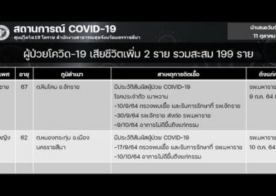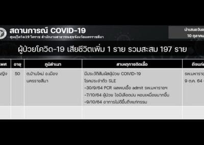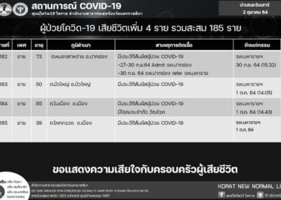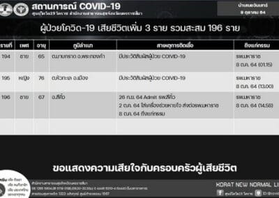 ทั้งนี้ จากข้อมูลศูนย์โควิด 19 โคราช จะเห็นว่า ตั้งแต่วันที่ 1-12 ตุลาคม 2564 มีรายงานผู้ป่วยโควิด 19 ที่อยู่ในเขต อ.เมืองนครราชสีมา เสียชีวิตจากโควิด 19 มากถึง 7 รายในเวลาไม่ถึง 2 สัปดาห์ ซึ่งเป็นข้อมูลที่น่าตกใจ โดยผู้ป่วยโควิดที่เสียชีวิตอยู่ในเขต ต.ในเมือง จำนวน 2 ราย ได้แก่ ผู้ป่วยหญิงอายุ 89 ปี และอีกรายเป็นชาย อายุ 85 ปี มีโรคประจำตัวเป็นวัณโรค ,อยู่ ต.หัวทะเล เป็นหญิง 1 ราย อายุ 76 ปี , ต.โคกกรวด เป็นชาย 1 ราย อายุ 39 ปี, ต.บ้านใหม่ 1 ราย เป็นหญิงอายุ 50 ปี โรคประจำตัว เป็น SLE หรือโรคแพ้ภูมิตัวเอง และที่ ต.หนองกระทุ่ม เป็นผู้ป่วยหญิง อายุ 20 ปี มีน้ำหนักตัว 100 กิโลกรัม กับอีกราย เป็นหญิง อายุ 62 ปี ซึ่งแต่ละรายมีประวัติสัมผัสผู้ป่วยติดเชื้อโควิด 19