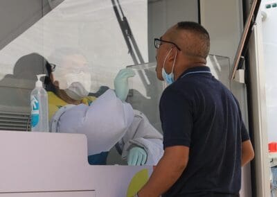 นครราชสีมา-วันนี้ (23 เมษายน 2564) ที่สนามหน้าศาลากลางจังหวัดนครราชสีมา นายวิเชียร จันทรโณทัย ผู้ว่าราชการจังหวัดนครราชสีมา ตรวจติดตามความเรียบร้อยการตรวจคัดกรองเชิงรุก การให้บริการประชาชนกลุ่มเสี่ยงในพื้นที่ เขต อ.เมืองนครราชสีมา ที่เดินทางมาตรวจหาเชื้อโควิด-19 หลังจากพระบาทสมเด็จพระเจ้าอยู่หัวฯ ทรงมีพระมหากรุณาโปรดเกล้าฯ พระราชทานรถเก็บตัวอย่างชีวนิรภัยให้จังหวัดนครราชสีมานำมาให้บริการตรวจคัดกรองเชิงรุกหาเชื้อโควิด-19 ให้กับประชาชนในพื้นที่เสี่ยงในเขตพื้นที่อำเภอเมืองนครราชสีมาและพื้นที่ใกล้เคียง จำนวน 3 คัน โดยสามารถตรวจหาเชื้อจากประชาชนกลุ่มเสี่ยงได้วันละ1,500 คน โดยไม่เสียค่าใช้จ่าย ที่สนามหน้าศาลากลางจังหวัดนครราชสีมา ตั้งแต่เวลา 09.00 น ในวันที่ 23 เมษายน 2564 จนกว่าสถานการณ์จะคลี่คลาย ซึ่งทางจังหวัดฯ ได้มีการกางตั้งเต็นท์ไว้ให้บริการประชาชน และกันสถานที่สำหรับจอดรถพระราชทาน