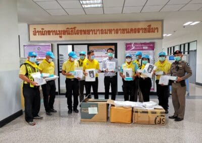 นครราชสีมา-วันนี้ ( 19 เมษายน 2564) ที่มูลนิธิ 100 ปี โรงพยาบาลมหาราชนครราชสีมา จ.นครราชสีมา พล.ต.ท.ต่อศักดิ์ สุขวิมล ผู้บัญชาการตำรวจสอบสวนกลาง มอบหมายให้จิตอาสา 904 พ.ต.ท.วิษณุ คำโนนม่วง สารวัตรตำรวจทางหลวงนครราชสีมา จิตอาสาตำรวจทางหลวงนครราชสีมา และชมรมฮักเขาใหญ่ ร่วมกันเป็นตัวแทนมอบชุด PPE จำนวน 100 ชุด และ Goggle แว่นตา จำนวน 37 อัน ให้กับโรงพยาบาลมหาราชนครราชสีมา เพื่อช่วยสนับสนุนการป้องกันการแพร่ระบาดของเชื้อไวรัสโควิด-19 ให้เจ้าหน้าที่ผู้ปฏิบัติงานทางการแพทย์และพยาบาลในพื้นที่ อ.ปากช่อง จ.นครราชสีมา ซึ่งมีนายแพทย์อนุชิต นิยมปัทมะ นายแพทย์ชำนาญการพิเศษ อายุรแพทย์โรคระบบทางเดินหายใจ กลุ่มงานอายุรกรรม โรงพยาบาลมหาราชนครราชสีมา เป็นผู้รับมอบ