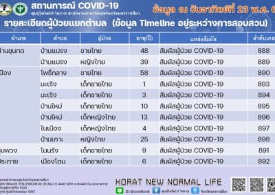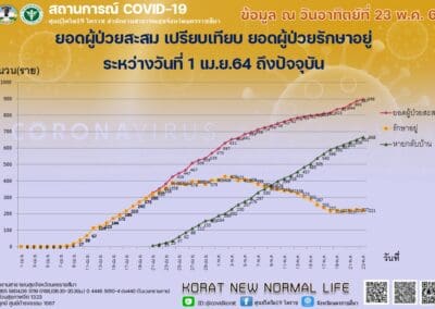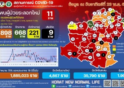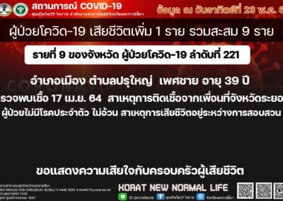 ส่วนสถานการณ์การแพร่ระบาดของโรคโควิด19 ในพื้นที่จังหวัดนครราชสีมา วันนี้พบผู้ป่วยรายใหม่ อีก 11 ราย เป็นชาย 2 ราย หญิง 2 ราย และเด็กชายกับเด็กหญิง อีก 7 ราย โดยตรวจพบที่ ต.โพธิ์กลาง ต.มะเริง ต.บ้านใหม่ ต.บ้านเกาะ และ ต.ในเมือง อ.เมืองนครราชสีมา จำนวน 7 ราย , ที่ ต.บ้านแปรง อ.ด่านขุนทด จำนวน 2 ราย ,ที่ ต.โนนรัง อ.ชุมพวง จำนวน 1 ราย และ ที่ ต.เมืองโดน อ.ประทาย จำนวน 1 ราย ทำให้มียอดผู้ป่วยสะสมอยู่ที่ 898 ราย โดยรักษาหายแล้ว 668 ราย ยังรักษาอยู่ 221 ราย และเสียชีวิตเพิ่ม 1 ราย รวมยอดสะสมเสียชีวิตเป็น 9 รายแล้ว โดยผู้เสียชีวิตรายที่ 9 ของจังหวัดนครราชสีมา เป็นเพศชาย อายุ 39 ปี อยู่ที่ ต.ปรุใหญ่ อ.เมืองนครราชสีมา ไทม์ไลน์ตรวจพบติดเชื้อโควิด19 เมื่อวันที่ 17 เมษายน 2564 ติดเชื้อมาจากเพื่อนี่ จ.ระยอง ผู้ป่วยไม่มีโรคประจำตัว ไม่อ้วน ทั้งนี้ สาเหตุการเสียชีวิตยังอยู่ระหว่างการสอบสวน