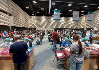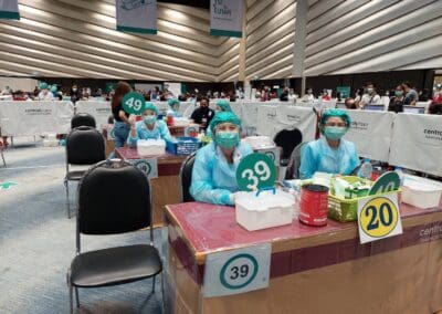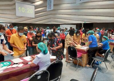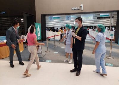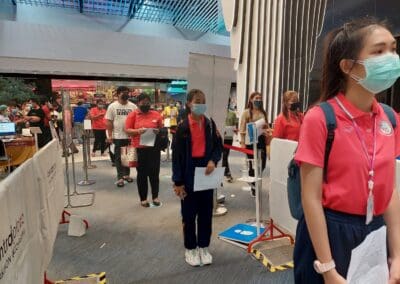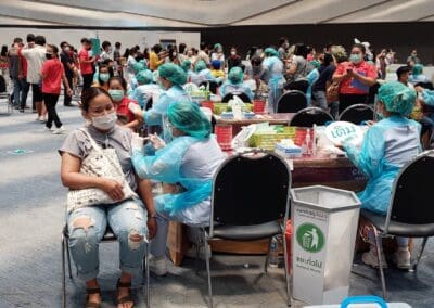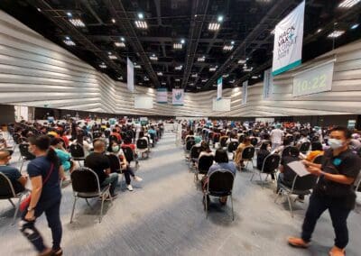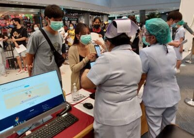 นครราชสีมา -วันนี้ (23 พฤษภาคม 2564) ที่ห้องโคราช ฮอลล์ ชั้น 4 เซ็นทรัลพลาซา นครราชสีมา การทดสอบระบบขั้นตอนการฉีดวัคซีนป้องกันไวรัสโควิด- 19 ของโรงพยาบาลมหาราชนครราชสีมา เป็นวันที่ 5 มีบุคลากรทางการแพทย์ เจ้าหน้าที่แพทย์ พยาบาล เจ้าหน้าที่สาธารณสุข ซึ่งเป็นด่านหน้า รวมทั้ง ประชาชนชาวจังหวัดนครราชสีมาบางส่วน ที่ลงทะเบียนผ่านช่องทางแอพพลิเคชั่น “หมอพร้อม” และโทรศัพท์ไปลงทะเบียนทางสายด่วน เดินทางไปฉีดวัคซีนป้องกันไวรัสโควิด-19 ตามสิทธิ์กันอย่างคึกคัก โดยเดินทางมารับการฉีดวัคซีนตั้งแต่เวลา 08.00 น. ก่อนจะเปิดบริการฉีดวัคซีนให้กับ 2 กลุ่มหลัก ได้แก่กลุ่มผู้สูงอายุ 60 ปีขึ้นไป และกลุ่มผู้ป่วยโรคเรื้อรัง 7 โรคที่จะมีขึ้นวันที่ 24 พฤษภาคมนี้ จากนั้น ในวันที่ 1 มิถุนายน 2564 จะดำเนินการฉีดให้กับประชาชนทั่วไป ซึ่งโรงพยาบาลมหาราชนครราชสีมา ได้คิ๊กออฟทดลองระบบขั้นตอนการฉีดวัคซีนป้องกันไวรัสโควิด- 19 ตั้งแต่เมื่อวันที่ 19 พฤษภาคมที่ผ่านมา เพื่อให้การทดสอบระบบเข้าที่ และแต่ละขั้นตอนมีความชัดเจนมากขึ้น ซึ่งมีความเป็นไปได้สูงที่จะฉีดได้ถึงวันละ 5,000 – 6,000 คน เพื่อสร้างภูมิคุ้มกันหมู่ให้เร็วที่สุด และมากที่สุด ทั้งนี้ จังหวัดนครราชสีมา มีเป้าหมายฉีดวัคซีนป้องกันโควิด19 ให้กับประชากรอายุ 18 ขึ้นไปในพื้นที่จังหวัด อย่างน้อย 70 % เป็นจำนวน 1,885,023 ราย ซึ่งข้อมูลวันนี้ ฉีดวัคซีนรายใหม่ได้ 4,867 ราย รวมยอดฉีดวัคซีนสะสม เท่ากับ 35,790 ราย หรือคิดเป็น 1.90 % เท่านั้น