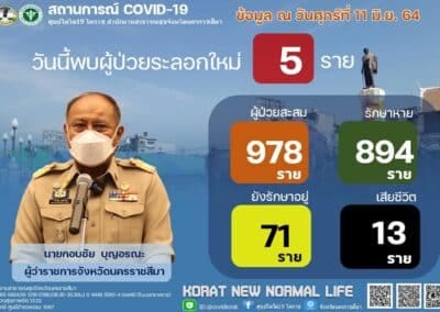 วันนี้ 11 มิ.ย.64 โคราชพบผู้ติดเชื้อโควิด-19 (ระลอกใหม่ เดือนเมษายน 2564) เพิ่ม 5 ราย รวมติดเชื้อสะสมทั้งหมด 978 ราย กำลังรักษาอยู่ 71 ราย รักษาหายแล้ว 894 ราย เสียชีวิตสะสม 13 ราย