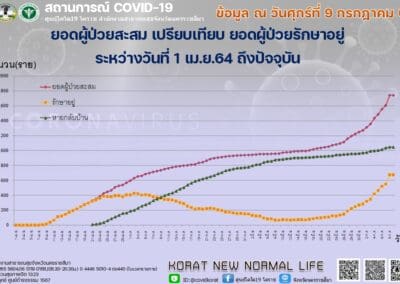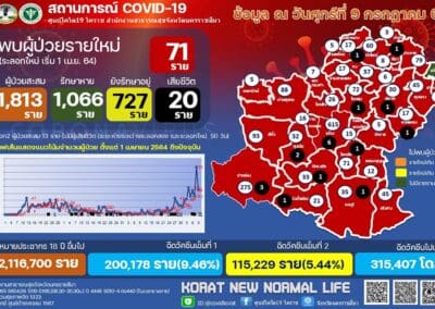 นครราชสีมา – วันนี้ (9 กรกฎาคม 2564) คณะกรรมการโรคติดต่อจังหวัดนครราชสีมา ได้เปิดเผยถึงสถานการณ์ไวรัสโควิด-19 ในพื้นที่ จ.นครราชสีมา ล่าสุดวันนี้ มีผู้ป่วยรายใหม่เพิ่มขึ้น จำนวน 71 ราย โดยแยกเป็นพบที่ อ.เมือง 10 ราย, อ.บัวใหญ่ 8 ราย, อ.แก้งสนามสนาง 1 ราย, อ.สูงเนิน 7 ราย, อ.พระทองคำ 1 ราย, อ.ขามสะแกแสง 4 ราย, อ.ปักธงชัย 4 ราย, อ.โชคชัย 4 ราย, อ.ชุมพวง 3 ราย อ.โนนสูง 2 ราย, อ.สีคิว 7 ราย, อ.วังน้ำเขียว 1 ราย, อ.คง 5 ราย, อ.ครบุรี 1 ราย, อ.สีดา 1 ราย, อ.ห้วยแถลง 1 ราย, เดินทางมาจากกรุงเทพฯ 7 ราย พระนครศรีอยุธยา 2 ราย และสมุทรปราการ 2 ราย โดยในจำนวนผู้ป่วยใหม่ 71 รายนี้ มาจากพื้นที่เสี่ยง 25 ราย, ส่งต่อผู้ป่วยชาว จ.นครราชสีมา 17 ราย, สัมผัสผู้ป่วย 22 ราย อยู่ระหว่างสอบสวนโรค 7 ราย รวมผู้ป่วยสะสมระลอกใหม่ จำนวน 1,813 ราย รักษาหายแล้ว จำนวน 1,066 ราย, ยังรักษาอยู่ จำนวน 727 ราย เสียชีวิต จำนวน 20 ราย