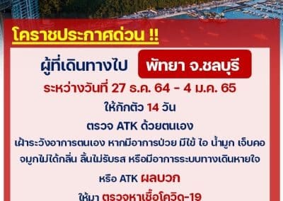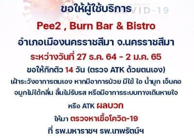 นครราชสีมา – วันนี้ (4 มกราคม 2565) สำนักงานสาธารณสุขจังหวัดนครราชสีมา ได้ประกาศขอให้ผู้ใช้บริการร้านอาหาร PEE 2 และร้าน BURN BAR & BISTRO ริมถนนสุรนารายณ์ อำเภอเมือง จังหวัดนครราชสีมา ระหว่างวันที่ 27 ธันวาคม 2564 – 2 มกราคม 2565 ขอให้ดำเนินการกักตัวเอง 14 วัน ตรวจ ATK ด้วยตัวเอง และเฝ้าระวังอาการ ซึ่งหากมีอาการป่วย มีไข้ ไอ น้ำมูก เจ็บคอ จมูกไม่ได้กลิ่น ลิ้นไม่รับรส หรือมีอาการทางระบบทางเดินหายใจ หรือผล ATK เป็นบวก ให้มาตรวจหาเชื้อโควิดที่โรงพยาบาลมหาราชนครราชสีมา โรงพยาบาลเทพรัตน์นครราชสีมา หรือโรงพยาบาลใกล้บ้านโดยด่วน หลังจากตรวจพบนักท่องเที่ยวไปนั่งรับประทานอาหารภายใน 2 ร้านดังกล่าวซึ่งอยู่ติดกัน ยืนยันผลติดเชื้อโควิด-19 แล้วจำนวน 5 ราย และขณะนี้กำลังรอผลตรวจบุคคลกลุ่มเสี่ยงอีกจำนวนหลายสิบราย ทั้งนี้จากการสอบสวนโรคเบื้องต้นยังไม่ทราบแน่ชัดว่า ต้นเหตุของการแพร่เชื้อในครั้งนี้มาจากบุคคลใด แต่คาดว่าน่าจะเป็นนักท่องเที่ยวกลุ่มหนึ่งที่เดินทางมาจากพัทยา ชลบุรี เดินทางไปท่องเที่ยวที่ร้านอาหารดังกล่าว และเป็นผู้ไปแพร่เชื้อโควิด ซึ่งสาธารณสุขได้สั่งการให้ปิดร้านอาหารทั้ง 2 ร้านดังกล่าวเป็นการชั่วคราวเพื่อทำความสะอาดฆ่าเชื้อโรคแล้ว.