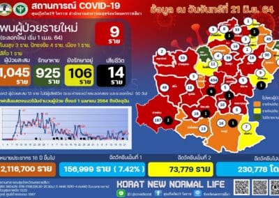 นครราชสีมา – วันนี้ (21 มิถุนายน 2564) คณะกรรมการโรคติดต่อจังหวัดนครราชสีมา ได้เปิดเผยถึงสถานการณ์การแพร่ระบาดของไวรัสโควิด-19 ในพื้นที่ จ.นครราชสีมาว่า ได้ตรวจพบผู้ติดเชื้อรายใหม่ในพื้นที่เพิ่มขึ้นอีก จำนวน 9 ราย รวมผู้ป่วยสะสมทั้งหมด จำนวน 1,045 ราย รักษาหายแล้ว จำนวน 925 ราย ยังรักษาอยู่ จำนวน 106 ราย และเสียชีวิต จำนวน 14 ราย สำหรับผู้ติดเชื้อรายใหม่ที่ตรวจพบวันนี้ จำนวน 9 ราย กระจายอยู่ในพื้นที่ 5 ตำบล 4 อำเภอ ได้แก่ ต.ในเมือง อ.เมือง จำนวน 1 ราย, ต.งิ้ว อ.ปักธงชัย จำนวน 3 ราย, ต.สะแกราช อ.ปักธงชัย จำนวน 1 ราย, ต.คลองไผ่ อ.สีคิ้ว จำนวน 1 ราย และ ต.มะค่า อ.โนนสูง จำนวน 3 ราย โดยขณะนี้อยู่ระหว่างกำลังสอบสวนไทม์ไลน์ของผู้ติดเชื้อ เพื่อแยกกลุ่มเสี่ยงสูง และเสี่ยงต่ำ ไม่ให้มีการแพร่กระจายเชื้อออกไปในวงกว้าง