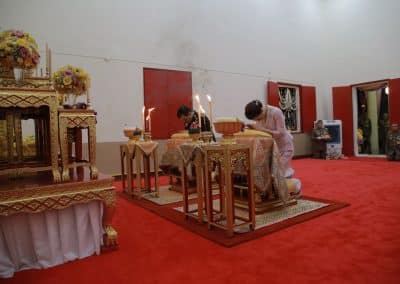 ทรงวางพวงมาลัย ทรงจุดธูปเทียนเครื่องนมัสการบูชาพระพุทธรูป (ปางมารวิชัย ศิลปะสุโขทัย) ทรงกราบ และเสด็จออกจากอุโบสถ