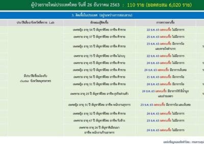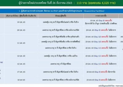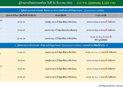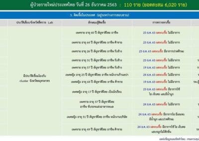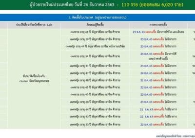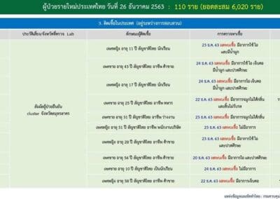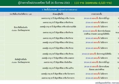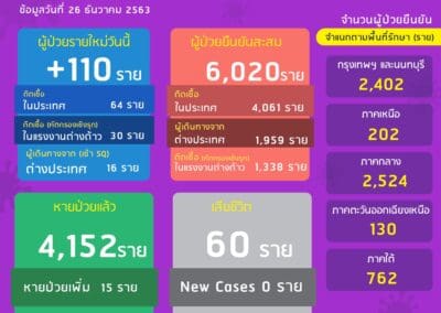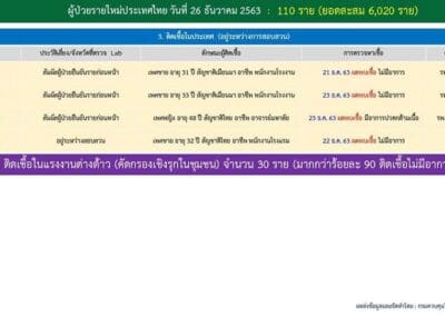 สถานการณ์การติดเชื้อ COVID-19 วันเสาร์ที่ 26 ธันวาคม 2563 Posted by Admin | Dec 26, 2020 | ข่าวประจำวัน สถานการณ์การติดเชื้อ COVID-19 วันเสาร์ที่ 26 ธันวาคม 2563 เวลา 11.00 น. สถานการณ์การติดเชื้อ COVID-19 ผู้ป่วยรายใหม่ 110 ราย ผู้ป่วยยืนยันสะสม 6,020 ราย หายป่วยแล้ว 4,152 ราย เสียชีวิตสะสม 60 ราย ขอบคุณข้อมูลจาก กรมควบคุมโรค กระทรวงสาธารณสุข Post Views: 58 FacebookFacebookXTwitterLINELine