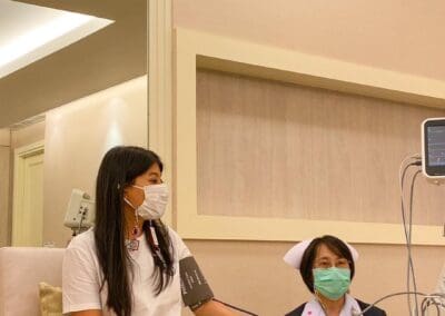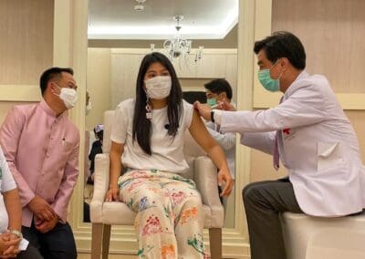 โดยการฉีดมี 8 ขั้นตอนตามระบบของกระทรวงสาธารณสุข เริ่มจากการลงทะเบียน, ตรวจร่างกาย ชั่งน้ำหนัก วัดความดันโลหิต คัดกรองความเสี่ยง รับการฉีดวัคซีน, จัดห้องพักสังเกตอาการหลังฉีดเป็นเวลา 30 นาที มีแพทย์ประจำเฝ้าสังเกตอาการ ทรงปลอดภัยและไม่มีพระอาการเเพ้ใดๆ.