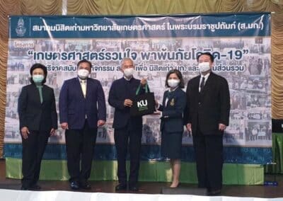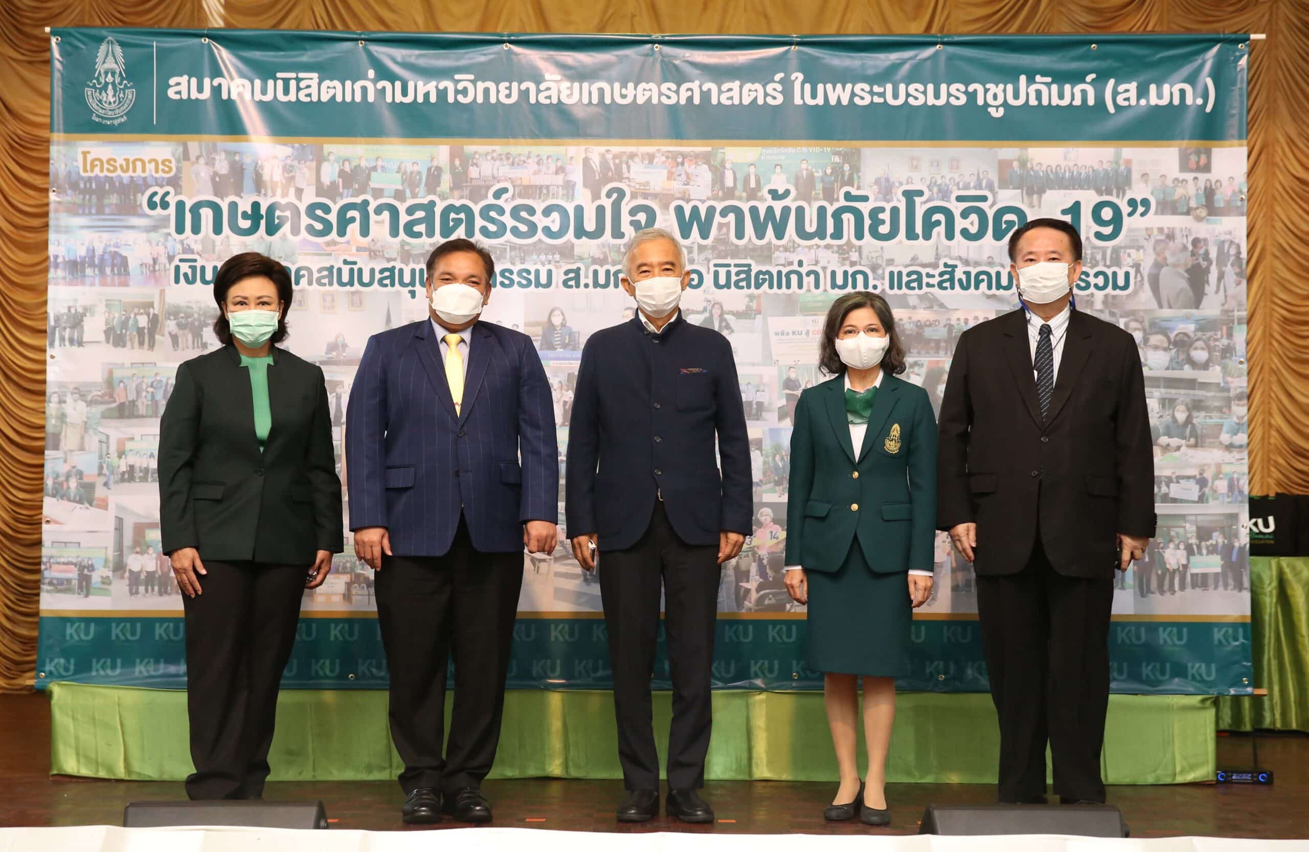 นางโสภาวรรณ มงคลธรรมากุล นายกสมาคมนิสิตเก่ามหาวิทยาลัยเกษตรศาสตร์ ในพระบรมราชูปถัมภ์ และ ดร.จงรัก วัชรินทร์รัตน์ อธิการบดีมหาวิทยาลัยเกษตรศาสตร์ ได้ร่วมกันแถลงข่าวการเปิดโครงการ “เกษตรศาสตร์รวมใจ พาพ้นภัย COVID-19” ณ ห้องนนทรี อาคารสมาคมนิสิตเก่า มหาวิทยาลัยเกษตรศาสตร์ ในพระบรมราชูปถัมภ์