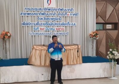 วันที่ 29 มีนาคม 2566 โรงแรมบรรจงจุรี จังหวัดสุราษฎร์ธานี นายจักกฤษ ศรีสิทธิพรหม หัวหน้าสาขาพรรคชาติพัฒนากล้า (ชพก.) ลำดับ 3 จังหวัดสุราษฎร์ธานี พร้อมคณะกรรมการ จัดการประชุมพรรคชาติพัฒนากล้า สาขาพรรคชาติพัฒนากล้า ลำดับที่ 3 ภาคใต้ จังหวัดสุราษฎร์ธานี เพื่อให้ความเห็นรายชื่อผู้สมัครเลือกตั้ง ส.ส. โดยมีผู้ร่วมเข้าประชุม 120 คน ที่ประชุมมีมติ ส่งผู้สมัครส.ส.จังหวัดสุราษฎร์ธานี ดังนี้