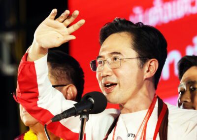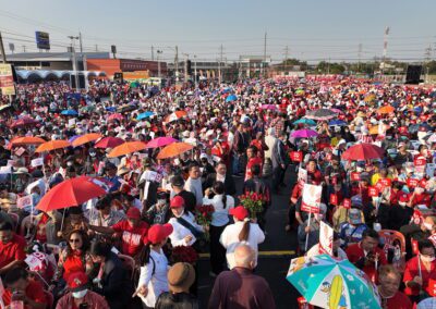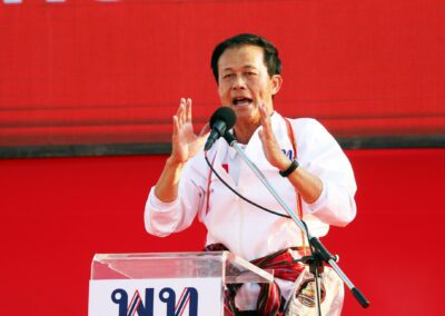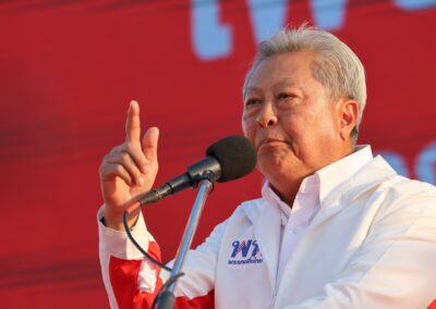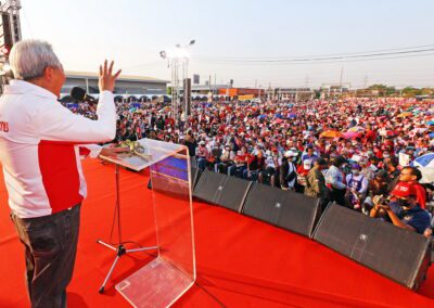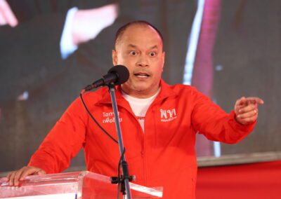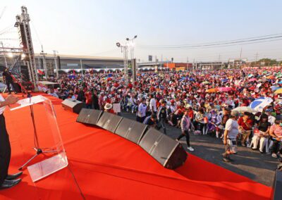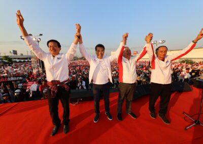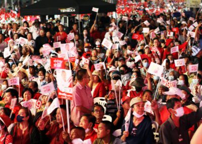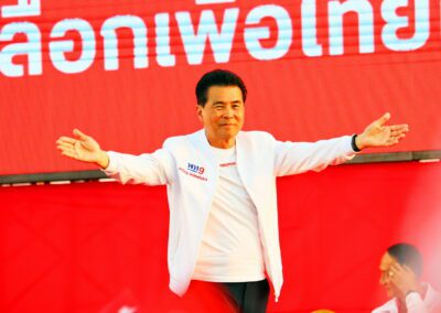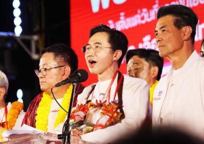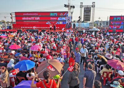 บนเวทีปราศรัย ยังมีการนำเสนอสไลด์ไทม์ไลน์นโยบาย “เพื่อไทยทำได้ พร้อมทำทันที” แบ่งเป็นระยะเร่งด่วนจนถึง 1 ปีหลังจัดตั้งรัฐบาล โดยนโยบายเร่งด่วนประกอบด้วย การปราบปรามยาเสพติด ยึดทรัพย์ผู้ค้ายาให้แล้วเสร็จภายใน 6 เดือน ปราบปรามแก๊งสแกมเมอร์ และให้ภาครัฐเป็นลูกค้าหลักของเอสเอ็มอีไทย