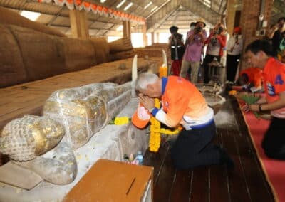 ผู้สื่อข่าวรายงานว่าระหว่างที่นายสุวัจน์นำทีมผู้สมัครเข้าสักการะพระนอนหินทราย มีภาพถ่ายของ พล.อ.ชาติชาย ชุณหะวัณ และนายสุวัจน์ ร่วมวางศิลาฤกษ์ก่อนสร้างหลังคาคลุมมพระนอน ซึ่งนายสุวัจน์ กล่าวว่าภาพดังกล่าวอายุ 30ปี ก่อสร้างหลังคาคลุมพระนอนหินทราย เป็นแหล่งโบราณสถานสิ่งศักดิ์สิทธิ์จะทำอะไรต้องทำพิธีก่อนจากนั้นได้เข้าสักการะขอพร