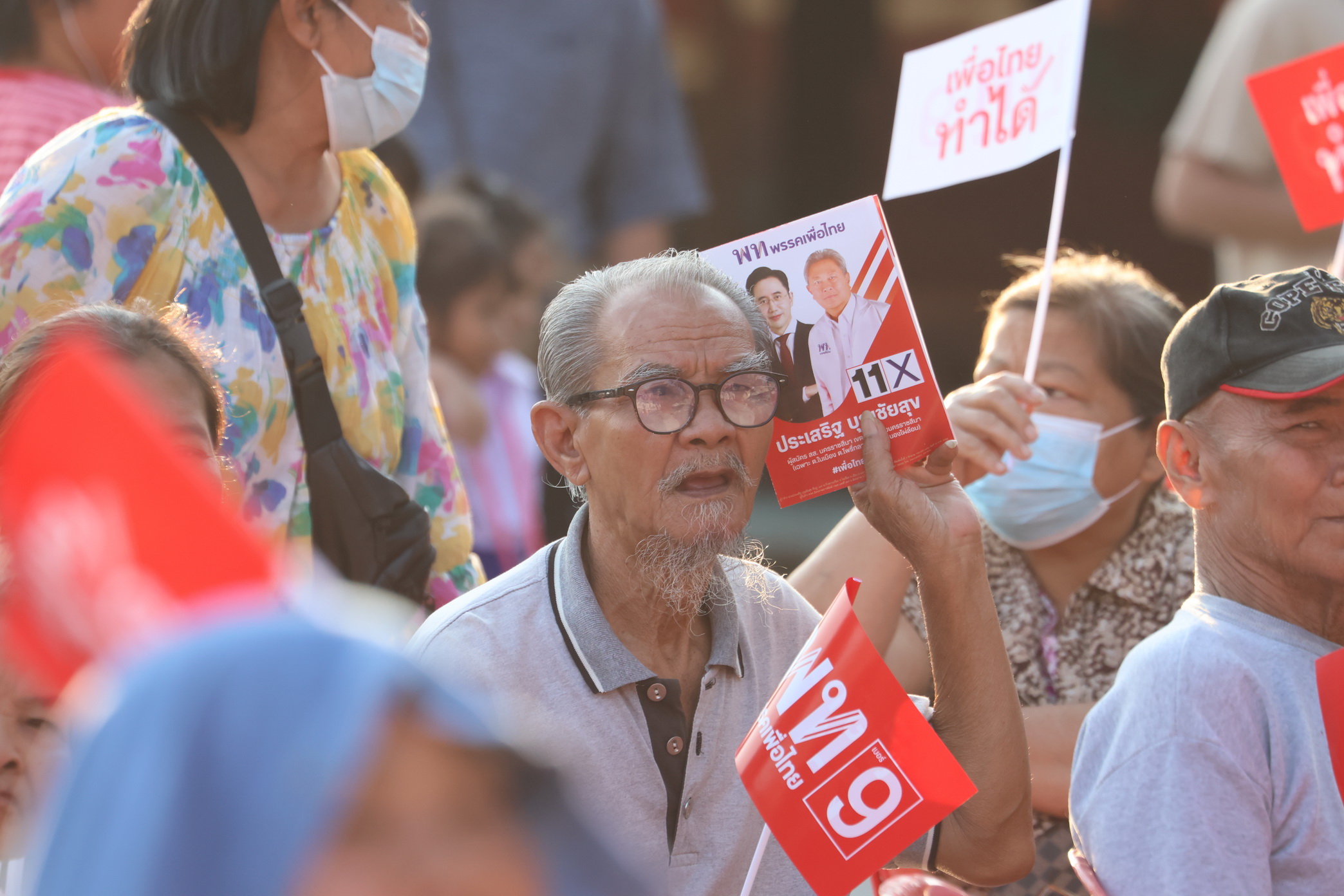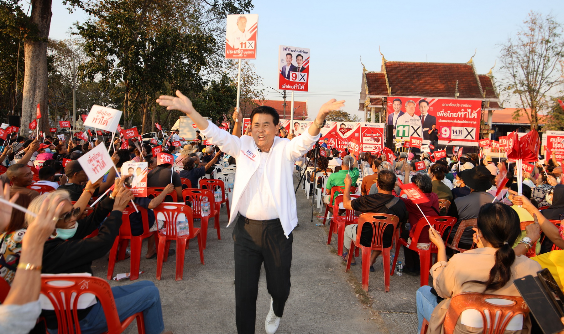 @jaophoto2022 ประเสริฐ เบอร์ 11 เพื่อไทยทำได้ โคราชเขต 1 “เทวัญ–ประเสริฐ” เปิดปราศรัยเขต 1 ชูนโยบายแก้หนี้–70:30 ชนะใจประชาชน วันที่ 21 มกราคม 2569 เวลา 17.00 น. พรรคเพื่อไทยจัดเวทีปราศรัยหาเสียงที่ลานเอนกประสงค์วัดหนองไผ่ ต.โพธิ์กลาง อ.เมืองนครราชสีมา จ.นครราชสีมา โดยมีนายเทวัญ ลิปตพัลลภ ผู้สมัคร ส.ส.ระบบบัญชีรายชื่อ หมายเลข 9 พร้อมด้วยนายประเสริฐ บุญชัยสุข ผู้สมัคร ส.ส.เขต 1 หมายเลข 11 และนายกิติพงศ์ พงษ์สุรเวท นายกเทศมนตรีตำบลโพธิ์กลาง ร่วมเวที ท่ามกลางประชาชนเข้าร่วมรับฟังประมาณ 2,500 คน บรรยากาศคึกคัก นายเทวัญ ปราศรัยชูนโยบาย “ยกเครื่องประเทศไทย เพื่อไทยทำได้” อาทิ ประกันกำไรพืชผลการเกษตร 30% การคืนที่ดินให้ประชาชน โครงการซื้อสินค้า 70:30 (รัฐจ่าย 70 ประชาชนจ่าย 30) โครงการบ้านเพื่อคนไทย โครงการล้างหนี้ประชาชน มาตรการปราบยาเสพติดและสแกมเมอร์แบบไม่จบไม่เลิก การยกระดับบัตรทอง 30 บาทด้วย AI เงินออมผ่านหวยเกษียณ รวมถึงคูปองซื้อปุ๋ยและเมล็ดพันธุ์ เพื่อยกระดับคุณภาพชีวิตประชาชน ด้านจุดยืนการแก้ไขรัฐธรรมนูญ นายเทวัญ ย้ำความชัดเจนของพรรคเพื่อไทยว่าจะปรับแก้เฉพาะจุดอ่อน เพื่อเสริมความเข้มแข็งประชาธิปไตยและพรรคการเมือง โดยยืนยันไม่แตะต้องหมวด 1 และหมวด 2 อย่างเด็ดขาด สำหรับเวทีปราศรัยใหญ่ในเขตเทศบาลนครนครราชสีมา วันที่ 26 มกราคมนี้ นายเทวัญระบุว่าเป็นพื้นที่สำคัญของจังหวัด พรรคเตรียมความพร้อมเต็มที่ โดยจะมีหัวหน้าพรรค แคนดิเดตนายกรัฐมนตรี และแกนนำสำคัญเข้าร่วมครบ พร้อมจัดที่นั่งรองรับประชาชนราว 20,000 คน และเชิญชวนชาวโคราชออกมารับฟังนโยบาย พร้อมให้โอกาสพรรคเพื่อไทยเข้าไปทำงานในการเลือกตั้งวันที่ 8 กุมภาพันธ์นี้.