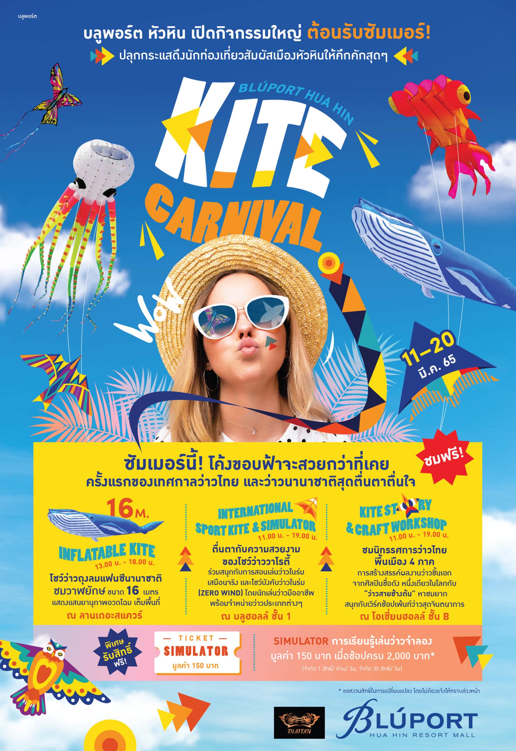 บลูพอร์ต หัวหิน ตอกย้ำความเป็นจุดหมายปลายทางการท่องเที่ยว (A Must Check In Destination) เปิดกิจกรรมใหญ่ต้อนรับซัมเมอร์สร้างสีสันเมืองหัวหิน พร้อมสนับสนุนเอกลักษณ์ของกีฬาและการละเล่นไทยดั้งเดิม กระตุ้นฤดูการท่องเที่ยว สร้างปรากฎการณ์เปลี่ยนท้องฟ้าซัมเมอร์นี้ ให้เต็มไปด้วยสีสัน ด้วยการจัดงาน “Bluport Hua Hin Kite Carnival” ครั้งแรกกับงานเทศกาลว่าวไทย และว่าวนานาชาติ ระหว่างวันที่ 11 -20 มีนาคม 2565 โดยร่วมกับ “THAITAN KITE TEAM THAILAND” (ไทยทั่น ไคท์ ทีม ไทยแลนด์) มืออาชีพที่ทำการแสดงว่าวแฟนชีจากนานาประเทศ นำไฮไลท์ว่าวถุงลมแฟนซีวาฬยักษ์ 16 เมตร การรวบรวมว่าว Sport Kite ที่เยอะที่สุด หายากที่สุด มีรูปแบบหลากหลายที่สุดในเมืองไทย และกิจกรรมพิเศษอีกมากมาย