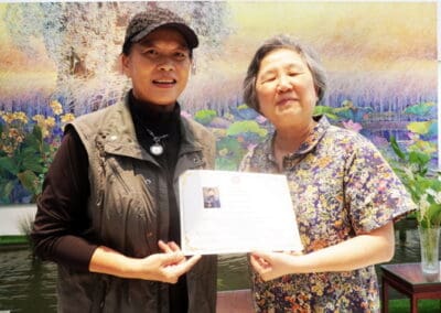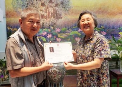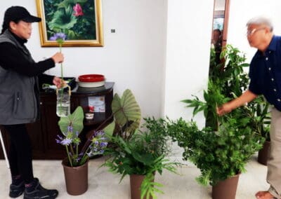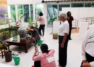 วันที่ 2 กรกฎาคม 2567 คุณสุจินตนา จรรยาทิพย์สกุล ประธาน JS Arts Gallery ประธานมูลนิธิเก้า ยั่ง ยืน กล่าวว่าคอร์สนี้ จัดขึ้นเพื่อให้ศิลปินแห่งชาติมีมุมมองใหม่ สําหรับการจัดดอกไม้ คิดว่าทุกท่านคงไม่มีใครเคยไปเรียนจัดดอกไม้ก็อยากให้ท่านเล่นกับดอกไม้และธรรมชาติ และนำมาทำเป็นศิลปะ คือ ท่านสัมผัสกับการเอาธรรมชาติมาเป็นศิลปะอยู่แล้ว ฉะนั้น การให้ได้เห็นธรรมชาติด้วยการใช้สติก็เป็นอีกอีกมุมมองหนึ่ง ท่านจะเอาหลักการของการวาดรูป การเป็นศิลปะวัตถุมาใช้ เราบอกว่าขอให้ตั้งลืมไว้ก่อน คือ วันนี้มาจัดดอกไม้ วันนี้เราจะเป็นคนจัดดอกไม้ ซึ่งดอกไม้ จะเป็นน้องคนไหนก็ตาม เขายังไม่รู้ใจอาจารย์เลย อยากให้อาจารย์เรียนรู้เขาหน่อย ว่าน้องกุหลาบ น้องเบญจมาส เป็นยังไงบ้าง เพราะว่าดอกไม้มีรูปอัตลักษณ์ที่แตกต่างกัน แต่สิ่งหนึ่งที่เหมือนกันคือ ดอกไม้ทุกดอกมีวิญญาณของเขาเราไม่รู้ จนกว่าเราจะสื่อสารคุยกับเขาได้ ซึ่งมันไม่ใช่เรื่องเพ้อเจ้อ บางคนบอกว่านี่เป็นลัทธิใหม่ ไม่ใช่มันเป็นปรัชญา เหมือนปรัชญาชาวพุทธ คือ การที่มีสติแค่ช่วงหนึ่งนาที