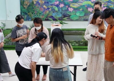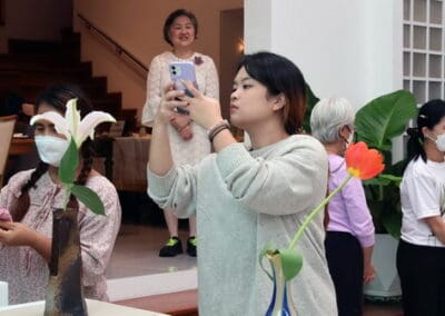 เป็นต้นหญ้า เป็นดอกไม้ข้างทาง แม้กระทั่งผักเราก็สามารถที่จะตัด แล้วก็นํามาจัดได้ สิ่งสําคัญคือกระบวนการในระหว่างที่เราจะจัดดอกไม้ อยากให้เราได้เรียนรู้ธรรมชาติอย่างแท้จริง ให้เวลากับตัวเองผ่อนคลายสบายๆ ค่อยๆ ซึมซับพลังของความงาม เมื่อนั้นจิตใจของเราจะได้รับความสงบสุขผ่อนคลาย และเราจะรู้สึกว่าตัวเราเอง มีคุณค่ามีความหมายต่อคนอื่นผ่านผลงานการจัดดอกไม้ของเรา