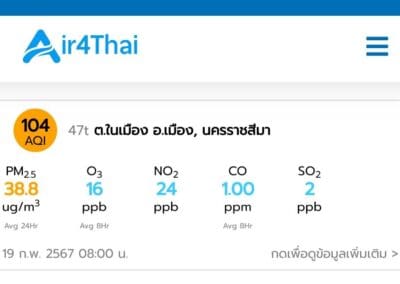โดยล่าสุดวันนี้ สำนักงานสิ่งแวดล้อมและควบคุมมลพิษที่ 11 (นครราชสีมา) รายงานสถานการณ์คุณภาพอากาศในพื้นที่จังหวัดนครราชสีมา ว่า ค่าฝุ่น PM 2.5 ในพื้นที่ ต.ในเมือ’ อ.เมืองนครราชสีมา ตรวจวัดผ่านแอพพลิเคชั่น Air4Thai เมื่อเวลา 08.00 น.ที่ผ่านมา อยู่ที่ 38.8 ไมโครกรัมต่อลูกบาศก์เมตร ซึ่งยังสูงกว่าค่ามาตรฐานไม่เกิน 37.5 ไมโครกรัมต่อลูกบาศก์เมตรที่กำหนดไว้ ในขณะที่ดัชนีคุณภาพอากาศ ซึ่งเป็นการตรวจวัดค่ามลพิษ 6 ชนิดในอากาศภาพรวม ตรวจวัดได้ 104 AQI อยู่ในเกณฑ์สีส้ม เริ่มมีผลกระทบต่อสุขภาพ ประชาชนต้องระวังสุขภาพ ลดระยะเวลาการทำกิจกรรมกลางแจ้ง และสวมหน้ากากอนามัยป้องกัน