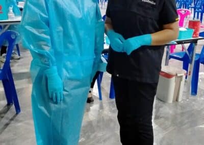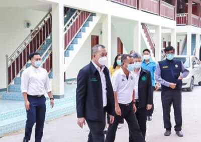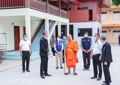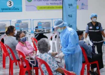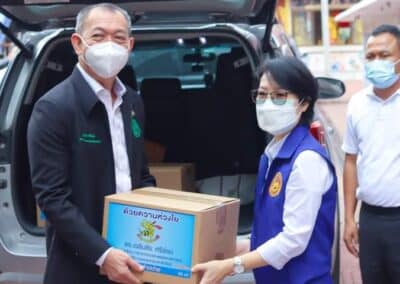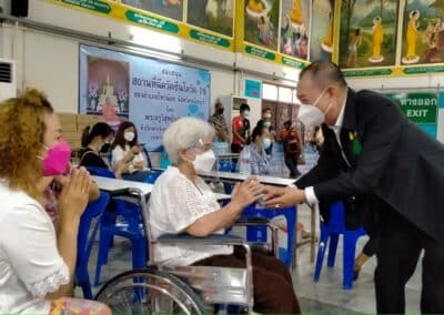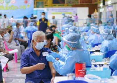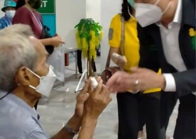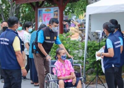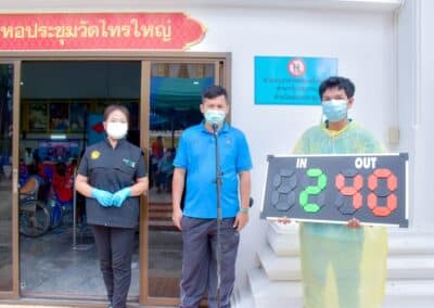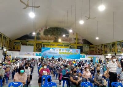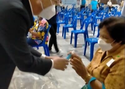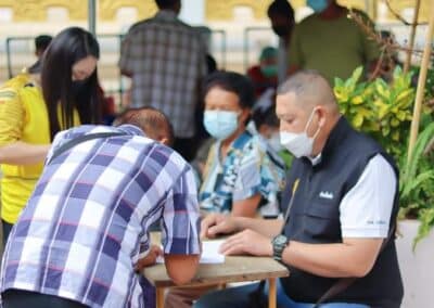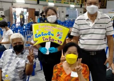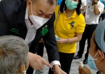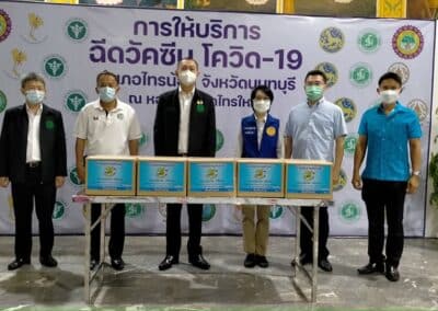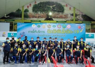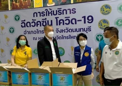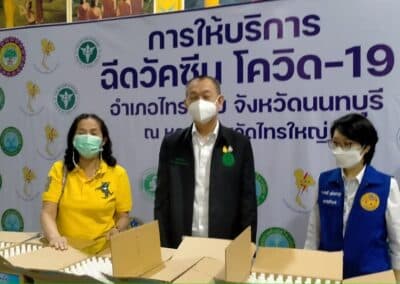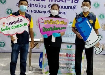 ร่วมด้วย นายกสัมฤทธิ์ ด้วงโสน นายกเทศมนตรีตำบลไทรน้อย ปลัด หัวหน้าส่วนราชการเทศมนตรีตำบลไทรน้อย ร่วมกันแจกแอลกฮอล์ให้กับผู้ที่เดินทางมาฉีดวัคซีน อำเภอไทรน้อย จังหวัดนนทบุรี ณ หอประชุมวัดไทรใหญ่ กลุ่มเป้าหมายที่ได้รับวัคซีน คือ กลุ่มผู้สูงอายุและ ประชาชน 7 โรคกลุ่มเสี่ยง จำนวน 1,000 คน