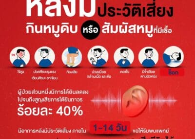 - หากมีอาการป่วย สงสัยโรคไข้หูดับโดยมีไข้สูง ปวดศีรษะ ร่วมกับประวัติเสี่ยง ขอให้รีบไปพบแพทย์ทันที แจ้งประวัติการกินหมูดิบและสัมผัสเนื้อหมูดิบให้ทราบ หากมาพบแพทย์และวินิจฉัยได้เร็ว ได้รับยาปฏิชีวนะเร็ว จะช่วยลดอัตราการเกิดหูหนวกและการเสียชีวิตได้ โดยเฉพาะในกลุ่มเสี่ยงที่หากติดเชื้อจะมีอาการป่วยรุนแรงเนื่องจากร่างกายมีภูมิต้านทานโรคต่ำได้แก่ ผู้ติดสุราเรื้อรัง ผู้มีโรคประจำตัว เช่น โรคเบาหวาน โรคความดันโลหิตสูง โรคไต โรคมะเร็ง โรคหัวใจ หรือผู้ที่เคยตัดม้ามออก เป็นต้น สามารถสอบถามข้อมูลเพิ่มเติมได้ที่ สายด่วนกรมควบคุมโรค โทร.1422.
