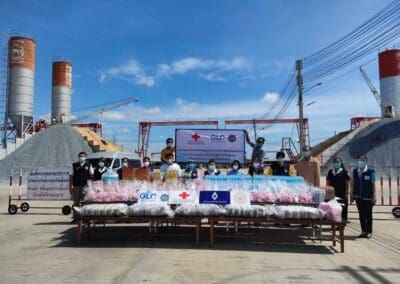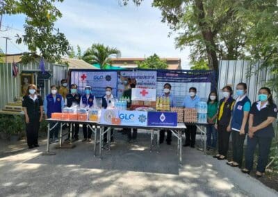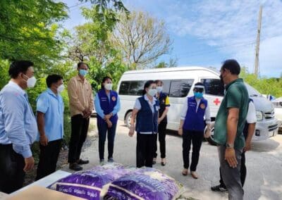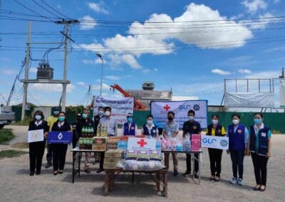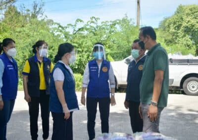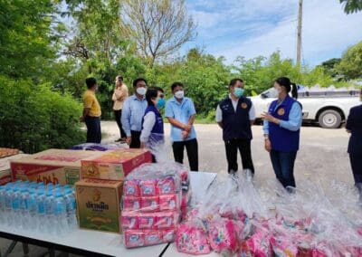 แพทย์หญิงสุวรรณา ไชยชุมศักดิ์ นายกเหล่ากาชาดจังหวัดนนทบุรี นางไปรยาพร งามเปี่ยม ผู้ช่วยนายกเหล่ากาชาดฯ กรรมการและสมาชิกเหล่ากาชาดฯ พร้อมด้วย นางสาววรรณี วุฒิฤทธากุล นายกกิ่งกาชาดอำเภอไทรน้อย/นายอำเภอไทรน้อย พร้อมทีมกิ่งกาชาดอำเภอ ปลัดอำเภอ เสมียนตราอำเภอ กำนัน ตำบลหนองเพรางาย ผู้ใหญ่บ้าน กำนันตำบลึลองขวาง และ ผู้ใหญ่บ้าน นายกอบต.หนองเพรางาย นายกอบต.คลองขวาง ผอ.รพ.สต.ในพื้นที่ ร่วมลงพื้นที่มอบเครื่องอุปโภค-บริโภค ให้กับคนงานที่อยู่ในพื้นที่ควบคุมตามประกาศเจ้าพนักงานควบคุมโรคติดต่อ จำนวน 3 แห่ง ดังนี้ 1. ส.บุญมีฤทธิ์ ม.3 ต.หนองเพรางาย จำนวน 156 คน 2. บริษัท สยามควอลิตี้ พรี-คาสท์ จำกัด ม.9 ต.หนองเพรางาย จำนวน 100 คน 3. บริษัท สยามเพาเวอร์ จำกัด ม.2 ต.คลองขวาง จำนวน 30 คน