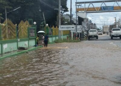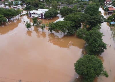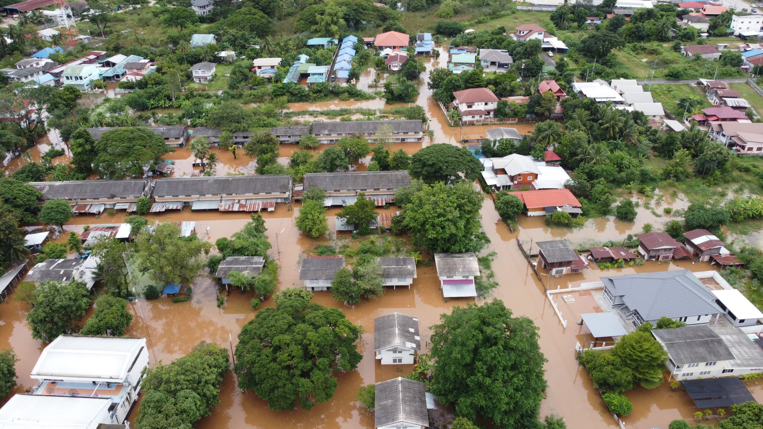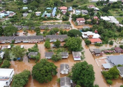 มุมสูง มวลน้ำยังคงทะลักเข้าท่วมอำเภอชุมพวง สถานที่ราชการอ่วม ระดับน้ำท่วมสูงเกือบ 1เมตรไปรษณีย์ปิดให้บริการหลังน้าท่วมสูง