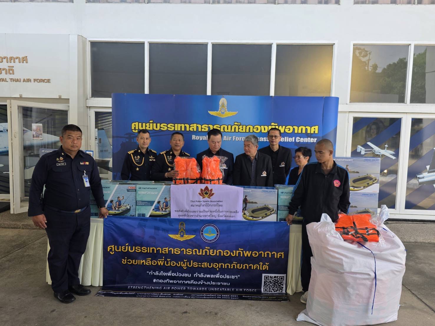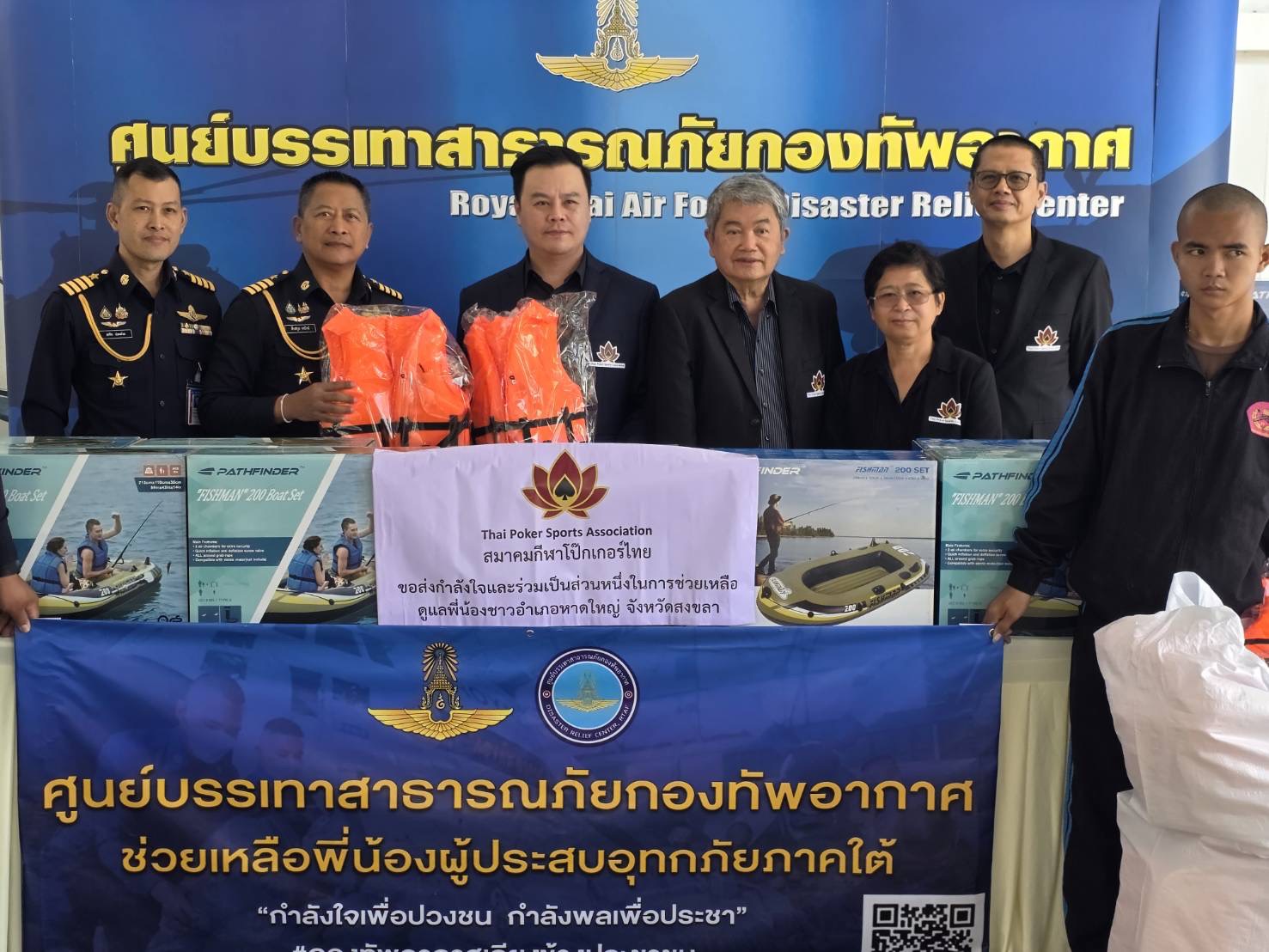 วันที่ 27 พฤศจิกายน 2568 นายธนา จุลพรรณศักดิ์ นายกสมาคมกีฬาโป๊กเกอร์ไทย พร้อมด้วย นายจิตรนรา นวรัตน์ เลขาธิการสมาคมฯ ได้มอบ “เรือยาง จำนวน 12 ลำ และเสื้อชูชีพ 50 ตัว” ให้กับกองทัพอากาศ เพื่อส่งต่อให้ทีมอาสาและหน่วยกู้ภัยใช้ลำเลียงสิ่งของและช่วยเหลือผู้ประสบอุทกภัยในพื้นที่ภาคใต้ โดยเฉพาะจังหวัดสงขลา อำเภอหาดใหญ่ ซึ่งกำลังเผชิญสถานการณ์น้ำท่วมหนัก
