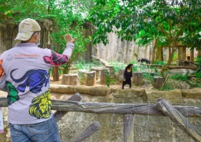 นายธนชน เคนสิงห์ ผู้อำนวยการสวนสัตว์นครราชสีมา จึงได้สั่งการให้ Keeperผู้ชำนาญการ จัดกิจกรรม Enrichment ซึ่งเป็นกิจกรรมเพิ่มคุณภาพชีวิตที่ดีให้กับสัตว์ช่วยลดความเครียด ส่งเสริมให้ สัตว์สามารถแสดงพฤติกรรมตามธรรมชาติได้อย่างเหมาะสม โดยนำลูกมะพร้าวอ่อน , กล้วย และ ฝรั่ง ผูกกับรอกเชือก และสาวรอกเข้าไปในส่วนแสดงหมีหมา ผลปรากฏว่า หมีหมาสามารถยืน 2 ขาและเดินเข้ามาหยิบอาหารด้วยอุ้งเท้าขาหน้าได้ จึงเป็นที่แน่ชัดแล้วว่า หมีหมามีพฤติกรรมและเดินคล้ายกับมนุษย์