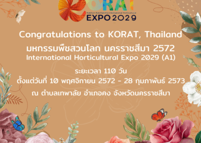 นครราชสีมา-วันนี้ (6 มีนาคม 2567) ที่กรุงโดฮาร์ ประเทศกาตาร์ สมาคมพืชสวนระหว่างประเทศ (The International Association of Horticultural Producers – AIPH) ประกาศให้สิทธิ์ประเทศไทยเป็นเจ้าภาพจัดงานมหกรรมพืชสวนโลก (International Horticultural Expo) หรือ “โคราช เอ็กซ์โป 2029” ซึ่งการได้รับสิทธิ์จัดงานระดับโลกครั้งนี้ จะช่วยยกระดับจังหวัดนครราชสีมาให้เป็นศูนย์กลางด้านนวัตกรรมและความยั่งยืนในอุตสาหกรรมพืชสวน ภายใต้แนวคิด “ธรรมชาติและพรรณพืชเขียวขจี อนาคตแห่งโลกสีเขียว” (Nature & Greenery: Envisioning the Green Future) โดยงาน “โคราช เอ็กซ์โป 2029” หรือ งานมหกรรมพืชสวนโลกนครราชสีมา พ.ศ. 2572 กำหนดจัดขึ้นระหว่างวันที่ 10 พฤศจิกายน 2572 ถึง 28 กุมภาพันธ์ 2573 ถือเป็นงานมหกรรมระดับโลก ประเภท A1 คาดว่า จะมีผู้เข้าร่วมชมงานจำนวน 2.6 – 4 ล้านคน
