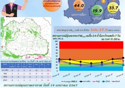 ซึ่งสำนักงานพัฒนาเทคโนโลยีอวกาศและภูมิสารสนเทศ (องค์การมหาชน หรือ GISDA) รายงานข้อมูลล่าสุดวานนี้(19 มกราคม 2567) ว่า จังหวัดนครราชสีมา มีค่าจุดความร้อน (Hot Spot) จำนวน 20 จุด โดยเกิดในพื้นที่เกษตรมากสุด 12 จุด , ป่าสงวน 5 จุด , เขต สปก. 2 จุด และพื้นที่อื่นๆ อีก 1 จุด ทำให้เกิดการสะสมของปริมาณฝุ่นเพิ่มสูงขึ้นต่อเนื่อง ซึ่งสภาพอากาศในช่วงนี้เริ่มร้อนแล้งเพิ่มมากขึ้น หากยังมีการลักลอบเผาแบบนี้  จะมีความเสี่ยงสูงที่ไฟจะลามไหม้อย่างรวดเร็ว ทำให้เกิดฝุ่นมลพิษฟุ้งกระจายเป็นวงกว้าง  มลพิษทางอากาศจะส่งผลกระทบต่อสุขภาพมากยิ่งขึ้นไปอีก  ขอให้ประชาชนทั่วไปใช้อุปกรณ์ป้องกันตนเอง เช่น หน้ากากป้องกัน PM2.5 ทุกครั้งที่ออกนอกอาคาร และจำกัดระยะเวลาในการทำกิจกรรมหรือการออกกำลังกายกลางแจ้งที่ใช้แรงมาก รวมถึง ให้สังเกตอาการผิดปกติ เช่น ไอ หายใจลำบาก ระคายเคืองตา  ส่วนประชาชนกลุ่มเสี่ยง ให้ใช้อุปกรณ์ป้องกันตนเอง เช่น หน้ากากป้องกัน PM2.5 ทุกครั้งที่ออกนอกอาคาร  เลี่ยงการทำกิจกรรมหรือการออกกำลังกายกลางแจ้งที่ใช้แรงมาก และให้ปฏิบัติตามคำแนะนำของแพทย์ หากมีอาการผิดปกติให้รีบไปพบแพทย์ .