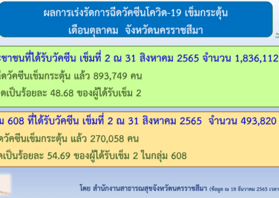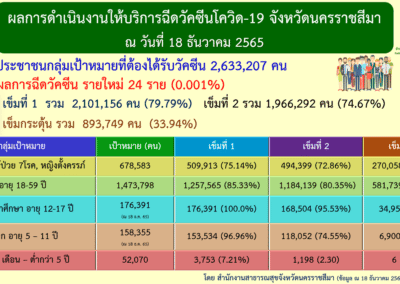ซึ่งผลดำเนินงานให้บริการฉีดวัคซีนโควิด 19 ของจังหวัดฯ ทางสำนักงานสาธารณสุขจังหวัดฯ ได้รายงานข้อมูลล่าสุด ณ วันที่ 18 ธันวาคม 2565 ว่า จากประชาชนกลุ่มเป้าหมายที่ต้องได้รับวัคซีน จำนวน 2,633,207 คน ฉีดเข็ม 1 ไปแล้ว 2,101,156 คน คิดเป็น ร้อยละ 79.79 ,เข็ม 2 ฉีดแล้ว 1,966,292 คน คิดเป็นร้อยละ 74.67 และเข็มกระตุ้น ฉีดไปแล้ว 893,749 คน คิดเป็นร้อยละ 33.94 เมื่อแยกรายกลุ่มเป้าหมาย พบว่า 1. กลุ่มผู้สูงอายุ ผู้ป่วย 7 โรคเรื้อรัง และหญิงตั้งครรภ์ มีเป้าหมาย 678,583 คน ฉีดเข็มกระตุ้นไปแค่ 270,058 คน คิดเป็นร้อยละ 39.80 , 2.กลุ่มประชาชน อายุ 18-59 ปี เป้าหมาย 1,473,798 คน ฉีดเข็มกระตุ้นแล้ว 581,739 คน คิดเป็นร้อยละ 39.47 , 3.กลุ่มนักเรียน / นักศึกษา อายุ 12-17 ปี เป้าหมาย 176,391 คน ฉีดเข็มกระตุ้นแค่ 34,956 คน คิดเป็นร้อยละ 19.82 , 4.กลุ่มนักเรียน / เด็ก อายุ 5-11 ปี เป้าหมาย 158,355 คน ฉีดเข็มกระตุ้นไป 6,900 คน คิดเป็นร้อยละ 4.41 และ 5.กลุ่มเด็ก อายุ 6 เดือน – ต่ำกว่า 5 ปี มีเป้าหมาย 52,070 คน ฉีดเข็มกระตุ้นไปแค่ 6 คนเท่านั้น คิดเป็นร้อยละ 0.01 ทางจังหวัดฯ จึงขอประชาสัมพันธ์เชิญชวนพี่น้องประชาชนทุกช่วงอายุ ไปเข้ารับวัคซีนโควิด 19 ได้ที่จุดบริการหอประชุมเปรมติณสูลานนท์ ด้านหลังศาลากลางจังหวัดนคราชสีมา วันจันทร์ถึงวันศุกร์ ช่วงบ่าย หรือที่โรงพยาบาลส่งเสริมสุขภาพตำบล ,สถานบริการสาธารณสุขทุกแห่งใกล้บ้าน หรือที่จุดบริการชั้น 4 ศูนย์การค้าเซ็นทรัลพลาซ่า นครราชสีมา เพื่อสร้างภูมิต้านทานให้กับตนเองและสร้างภูมิคุ้มกันหมู่ ก่อนเดินทางไปท่อ