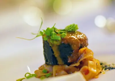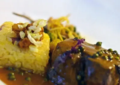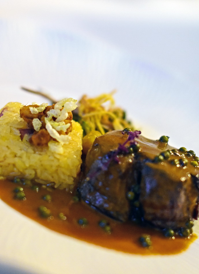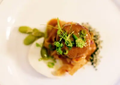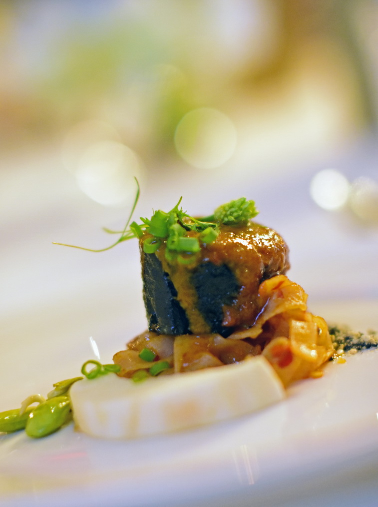 เชฟพรพรรณ ยังได้สร้างสรรค์เมนคอร์ส สเต็กเนื้อวัวดำลำตะคอง ซอสแกงป่า เสิร์ฟคู่ข้าวผสมข้าวฮาง–ข้าวเม่า พร้อมน้ำปลาร้าแจ่ว กลายเป็นจานอาหารที่สะท้อน “อีสานระดับโลก” อย่างแท้จริง