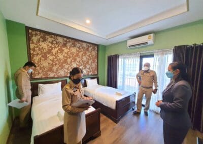 จากนั้นเวลา 15.30 น. ผวจ.นม. ได้เดินทางตรวจติดตามและให้คำแนะนำกับผู้ประกอบการโรงแรมในการให้บริการที่พักแก่พนักงานของบริษัทคาร์กีลมีทส์ (ประเทศไทย) จำกัด เข้าพักตามมาตรการ Bubble & Seal และ Seal Route ของโรงงาน จำนวน 3 แห่งในพื้นที่อำเภอเมืองนครราชสีมา ได้แก่ โรงแรมลีโอซอ โรงแรมชุณหลีแกรนด์ และเพ็ญณกรอพาทเมนต์โดยทั้ง 3 แห่ง มีความพร้อมในการดำเนินการให้เป็นไปตามมาตรการสาธารณสุขของภาครัฐ