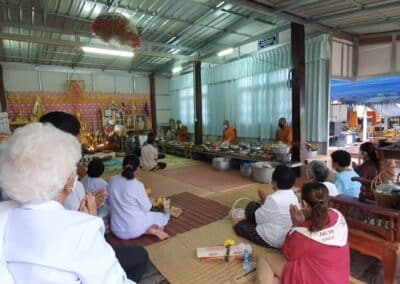โดยพระภิกษุสงฆ์จะวางบาตรไว้ที่เต็นท์ด้านล่าง ให้ชาวบ้านนำข้าวสวยมาตักใส่บาตร พร้อมด้วยขนมข้าวต้ม ขึ้นประเคน โดยจำกัดจำนวนชาวบ้านบนศาลาการเปรียญ ไม่ให้เกินจำนวน 20 คน ซึ่งชาวบ้านส่วนใหญ่ที่เดินทางมาใส่บาตรเสร็จ จะกลับบ้านไปฟังเสียงพระสวดมนต์ให้พร กรวดน้ำ ผ่านลำโพงขยายเสียงของทางวัด