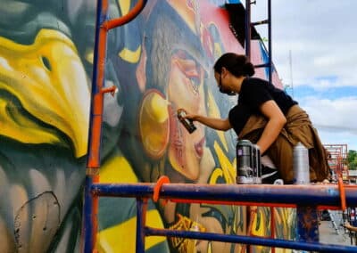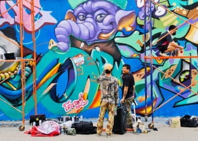นครราชสีมา – วันนี้ (28 พฤศจิกายน 2566) ที่บริเวณกำแพงอู่รถทัวร์ “นครชัยขนส่ง” ถนนไชยณรงค์ ต.ในเมือง อ.เมือง จ.นครราชสีมา ได้มีนักท่องเที่ยวและประชาชนทั่วไป พากันมาถ่ายรูปเซลฟี่กับรูปภาพกราฟฟิตี้กันอย่างคึกคัก ภายหลังจากที่เพจเฟสบุ๊ค “โคราชเมืองศิวิไลซ์” ได้เผยแพร่กิจกรรมของกลุ่มกราฟฟิตี้ “K-BATTLE GRAFF JAM 2023” ทั้งชาวไทยและชาวต่างชาติที่เดินทางมาจากทั่วประเทศกว่า 30 ราย เพื่อมาร่วมสร้างผลงานศิลปะกราฟฟิตี้ ระหว่างวันที่ 25-26 พ.ย.ที่ผ่านมา ภายใต้คอนเซ็ปต์ “DAY OF FUTURE, DAY OF UNITY” โดยพ่นกำแพงริมถนนไชยณรงค์ เป็นระยะทางยาวกว่า 150 เมตร ให้กลายเป็นแลนด์มาร์คศิลปะกราฟฟิตี้ร่วมสมัยยาวที่สุดในภาคอีสาน นอกจากนี้ยังมีการไปสร้างศิลปะกราฟฟิตี้ บนตู้หม้อแปลงไฟฟ้าริมถนนมหาดไทยอีก 2 ตู้ เพื่อลบรอยที่ถูกคนมือบอนนำสีมาพ่นใส่ให้กลายเป็นภาพกราฟฟิตี้สวยๆ อีกด้วย ซึ่งกิจกรรมของกลุ่มกราฟฟิตี้ “K-BATTLE GRAFF JAM 2023” ครั้งนี้ ได้รับการสนับสนุนจากสำนักงานศิลปวัฒนธรรมร่วมสมัย กระทรวงวัฒนธรรม จนมีชาวโซเชี่ยลพากันแห่แชร์ทำให้มีนักท่องเที่ยว เดินทางมาถ่ายรูปเซลฟี่กันอย่างไม่ขาดสาย