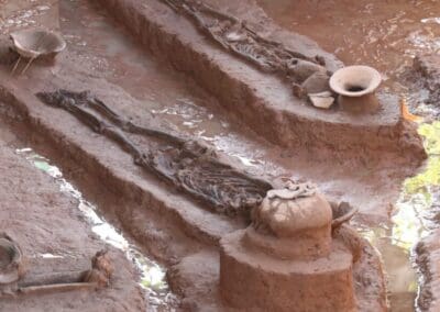 นายวรรณพงษ์กล่าวว่า การพบร่องรอยการฝังศพของมนุษย์ร่วมกับหม้อดินเผาแบบบ้านปราสาท รูปทรงคนโทปากแตรมีเชิง ทาน้ำดินสีแดงถูกยกให้เป็นรูปแบบเด่นของภาชนะดินเผา สมัยสำริดในพื้นที่ลุ่มแม่น้ำมูลตอนบนกำหนดอายุสมัยอยู่ในช่วง 3,000-2,500 ปีมาแล้ว ซึ่งมีสภาพสมบูรณ์ 3 โครง หันศีรษะไปทางด้านตะวันตกเฉียงเหนือ บริเวณเหนือศีรษะและปลายเท้าพบภาชนะดินเผาแบบบ้านปราสาทฝังร่วมเหมือนกันทั้งหมด สำหรับโครงกระดูกมนุษย์ หมายเลข 8 สวมกำไลหินอ่อนที่แขนข้างขวาและโครงกระดูกมนุษย์หมายเลข 9 สวมกำไลหอยมือเสือที่แขนข้างขวา ทั้ง 2 โครง ถูกฝังในแนวขนานกัน นักวิชาการตั้งข้อสงสัยถูกฝังพร้อมกันหรือไม่ ความพิเศษของการฝังศพสมัยสำริดคือโครงกระดูกมนุษย์หมายเลข 7 ลำตัวอยู่ในลักษณะตะแคงซ้าย แขนข้างซ้ายและข้างขวาอยู่ในลักษณะประสานมือเหนือกระดูกเชิงกราน ขาข้างซ้ายเหยียดตรง ขาข้างขวายกงอตั้งขึ้นและยังคงรูปแบบการฝังภาชนะดินเผาเหนือศีรษะและปลายเท้าร่วมด้วย