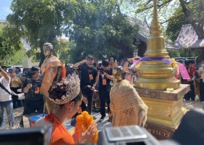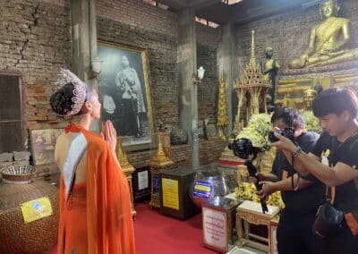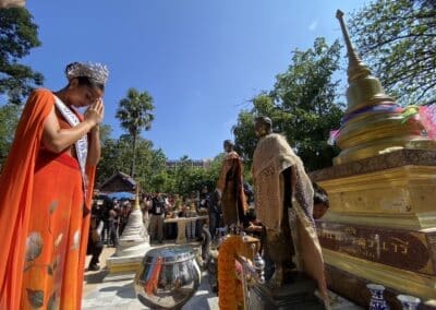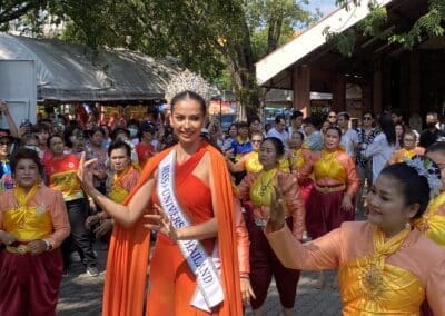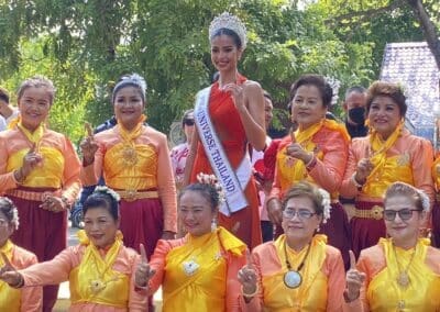 โดยในวันนี้ “น้องแอน” มาในชุดสีส้มสวยงามซึ่งเป็นสีประจำจังหวัดนครราชสีมา โดยเป็นชุดกางเกงมีลายดอกไม้สวยงาม ส่วนท่อนบนเป็นลักษณะตะเบงมาน ก่อนที่จะเข้ากราบพระประจำโบสถ์ของวัดศาลาลอยก่อนที่จะเข้ากราบสักการะเจดีย์บรรจุอัฐิของย่าโม และรับชมการแสดงของสตรีชาวจังหวัดนครราชสีมา ที่มาร่วมรำบวงสรวงย่าโมพร้อมกับต้อนรับ Miss Universe Thailand 2023 คนล่าสุด ที่เป็นลูกหลานชาวโคราช ก่อนที่ “น้องแอน” จะทนเสียงเรียกร้องของแฟนคลับชาวโคราชไม่ไหวจนต้องออกมารำพร้อมกับนางรำโดยที่ไม่ได้มีการซักซ้อมมาแต่อย่างใด โดยลีลาการรำของน้องแอนก็อ่อนช้อยสวยงามถึงแม้จะไม่ได้มีการซ้อมมาแต่ก็รำอย่างตั้งใจจนเรียกรอยยิ้มและเสียงปรบมือจากแฟนคลับที่มารอต้อนรับได้เป็นอย่างดี จากนั้น “น้องแอน” ได้เข้ากราบขอพรภายในโบสถ์กลางน้ำก่อนที่จะลงมาโชว์การผัดหมี่โคราช ซึ่งถือว่าเป็นเมนูยอดนิยมประจำจังหวัดนครราชสีมา ก่อนที่จะแจกจ่ายให้กับบรรดาชาวบ้านและแฟนคลับที่มารอต้อนรับอยู่ภายในวัด