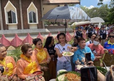 นครราชสีมา – วันนี้ (3 ก.ย.66) ที่ วัดศาลาลอย ต.ในเมือง อ.เมือง จ.นครราชสีมา “น้องแอน” หรือนางสาวแอนโทเนีย โพซิ้ว Miss Universe Thailand 2023 คนล่าสุด ได้เดินทางมากราบสักการะอัฐิท้าวสุรนารีหรือย่าโม และสิ่งศักดิ์สิทธิ์ภายในวัดศาลาลอยพร้อมกับโชว์การผัดหมี่โคราชอาหารยอดนิยมของจังหวัดนครราชสีมาแจกให้กับประชาชนและแฟนคลับชาวโคราชที่แห่มารอต้อนรับหลายร้อยคน