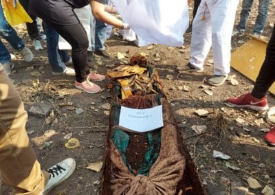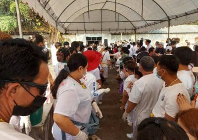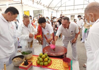 โดยก่อนทำพิธีย้ายร่าง ทางมูลนิธิฯ ได้เชิญม้าทรง มาประกอบพิธีคุยกี เปิดทางขอเจ้าที่ก่อนเคลื่อนย้ายร่างผู้เสียชีวิตไร้ญาติเหล่านี้ ซึ่งมีเจ้าหน้าที่มูลนิธิ และประชาชนพร้อมใจแต่งกายด้วยชุดสีขาว ร่วมประกอบพิธีอย่างตั้งใจ เพราะถือว่าเป็นการทำบุญมหากุศลครั้งใหญ่ ซึ่งร่างผู้เสียชีวิตเหล่านี้ ส่วนใหญ่จะประสบอุบัติเหตุ หรือเสียชีวิตโดยที่ไม่มีญาติมาติดต่อรับร่างไปบำเพ็ญกุศลทางศาสนา ทางโรงพยาบาลมหาราชนครราชสีมา จึงส่งร่างมาฝากเก็บไว้ที่โกดังแห่งนี้ จะมีทั้งร่างของเด็กทารกที่เสียชีวิตแล้ว ถูกดองใส่ขวดโหลเก็บเอาไว้ จำนวน 5 โหล และร่างของผู้เสียชีวิตไร้ญาติรายอื่นๆ ที่เปื่อยสลายแล้ว นำมาประกอบพิธีฯ ก่อนเคลื่อนย้ายไปยังสุสานโชคชัยฯ
