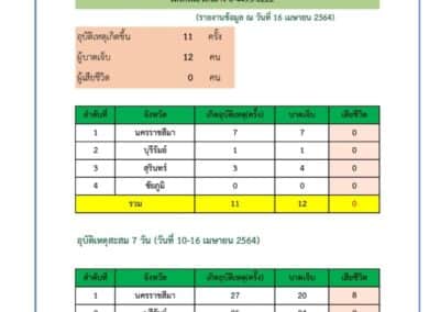 นครราชสีมา – วันนี้ (17 เมษายน 2564) นายสิทธิพล เสงี่ยม ผู้อำนวยการศูนย์ป้องกันและบรรเทาสาธารณภัย เขต 5 นครราชสีมา เปิดเผยสรุปผลการดำเนินงานป้องกันและลดอุบัติเหตุทางถนนช่วงเทศกาลสงกรานต์ 2564 (ระหว่างวันที่ 10 – 16 เมษายน 2564) ของกลุ่มจังหวัด “นครชัยบุรินทร์” 7 วันของการรณรงค์ “สงกรานต์สุขใจ ขับขี่ปลอดภัย ห่างไกลโควิด” จากการรายงานของศูนย์ปฏิบัติการร่วมป้องกันและลดอุบัติเหตุทางถนนช่วงเทศกาลปีใหม่ 2564 จังหวัด พบว่า 4 จังหวัดอีสานตอนล่างหรืออีสานใต้ เกิดอุบัติเหตุรวม 101 ครั้ง จำนวนผู้บาดเจ็บ 94 คน จำนวนผู้เสียชีวิต 18 ราย