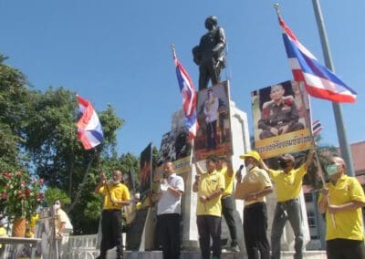 นครราชสีมา – วันนี้ (22 ตุลาคม 2563) เวลา 13.00 น. ที่ลานข้างอนุสาวรีย์ท้าวสุรนารี อ.เมือง จ.นครราชสีมา ได้มี “กลุ่มประชาชนที่รักชาติ ศาสนา พระมหากษัตริย์ จังหวัดนครราชสีมา” พร้อมใจกันใส่เสื้อเหลือง เดินทางมาร่วมชุมนุมกว่า 700 คน เพื่อแสดงพลังปกป้องสถาบัน และเคลื่อนไหวสนับสนุนให้ พล.อ.ประยุทธ์ จันทร์โอชา บริหารประเทศต่อไป ซึ่งผู้ร่วมชุมนุมส่วนใหญ่จะเป็นผู้สูงอายุ ข้าราชการบำนาญ อดีตแนวร่วม กปปส.โคราช และลูกศิษย์ของสำนักสันติอโศก นอกจากนี้ยังมีการนำพระบรมฉายาลักษณ์ ของรัชกาลที่ 9 และรัชกาลที่ 10 มาตั้งไว้บริเวณด้านหน้าผู้ชุมนุม เรียกร้องให้กลุ่มคณะราษฎร 63 และกลุ่มเยาวชนปลดแอก หยุดกล่าวจาบจ้วงสถาบันพระมหากษัตริย์ อันเป็นที่รักของปวงชนชาวไทย