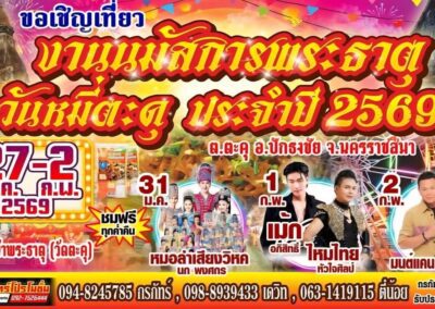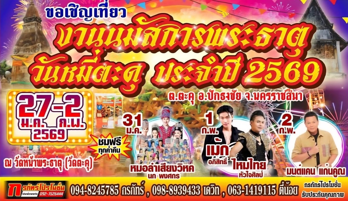 นอกจากนี้ ยังมี ฟรี คอนเสิร์ตจากศิลปินดัง ทั้งมนต์แคน แก่นคูณ / เม้ก อภิสิทธิ์ – ไหมไทย หัวใจศิลป์ และหมอลำ เสียงวิหค นกพงศกร ที่จะมาสร้างความเพลิดเพลิน เปิดให้เข้าชมฟรีตลอดงาน จึงขอเชิญชวนมา “อิ่มบุญ อิ่มท้อง อิ่มตา” กับของดีปักธงชัย นมัสการพระธาตุ และกินหมี่ตะคุ ได้ใน “งานนมัสการพระธาตุ และกินหมี่ตะคุ ประจำปี 2569” ซึ่งจะจัดยาวไปจนถึงวันที่ 2 กุมภาพันธ์ 2569 ที่วัดหน้าพระธาตุ หรือ วัดตะคุ ต.ตะคุ อ.ปักธงชัย จ.นครราชสีมา .