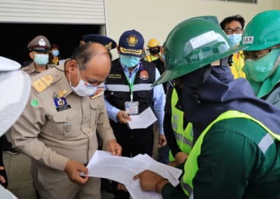 นายกอบชัย บุญอรณะ ผู้ว่าราชการจังหวัดนครราชสีมา กล่าวว่า การตรวจสอบครั้งนี้พบว่ายังต้องมีข้อปรับปรุงในเรื่องมาตรการป้องกันการแพร่ระบาดของไวรัสโควิด-19 หลายข้อ ซึ่งก็ได้มีการแนะนำตักเตือนไป โดยเฉพาะการควบคุมดูแลบุคคลที่เดินทางเข้า ออก ในสถานที่ทำงานและที่พัก จะต้องมีการดเข้มงวดถึงมาตรการให้มากกว่านี้ เนื่องจากบุคคลภายนอกเป็นบุคคลที่จะมีโอกาสนำเชื้อเข้ามาแพร่กระจายภายในแคมป์คนงานซึ่งมีคนงานเป็นจำนวนมาก หากมีการแพร่เชื้อจะเกิดการกระจายเชื้อได้ง่าย ถึงแม้ว่าแคมป์คนงานแห่งนี้จะมีการควบคุมให้คนงานทั้งหมดทั้งแรงงานไทยและแรงงานต่างด้าวอาศัยอยู่ในไซด์ทำงาน แต่สิ่งที่น่าเป็นห่วงอีกเรื่อง ได้แก่ เรื่องสุขภาวะ สาธารณสุข ความสะอาด ภายในที่พัก เรื่องนี้ก็สำคัญนอกเหนือจากระบบในสถานที่ทำงาน ทั้งนี้ได้แนะนำให้ผู้ประกอบการปรับปรุงเรื่องการคัดกรองกลุ่มคนงานที่จะเข้ามาทำงานในพื้นที่ ต้องมีการลงทะเบียน วัดไข้ และสวมใส่แมส จะต้องเข้มงวดมากกว่านี้ เนื่องจากถึงเวลาพัก แรงงานเหล่านี้จะกลับไปที่ ที่พัก จึงต้องกำชับให้มีการเข้มงวดในเรื่องนี้ อย่างไรก็ตามในเมื่อได้มีการตักเตือนไปแล้ว ผู้ประกอบการจำเป็นต้องดำเนินการแก้ไข หาก มีการเข้ามาตรวจสอบและยังเพกเฉยไม่แก้ไข อาจจะต้องพิจารณาให้หยุดการดำเนินกิจการ หยุดการก่อสร้างทั้งหมดเพื่อให้มีการจัดทำระบบคัดกรองที่ถูกต้อง เรื่องนี้ได้เน้นย้ำไปยังผู้ดูแลแล้ว ทุกพื้นที่ ทุกอำเภอ ที่มีแคมป์คนงานจะต้องดำเนินการเช่นเดียวกัน หากแคมป์ที่พัก หรือไซด์งานใด ฝ่าฝืนจะต้องถูกพิจารณาสั่งปิดเช่นกัน เราจะไม่ยอมเสี่ยงให้เกิดการระบาดในพื้นที่ขึ้นอีกโดยเฉพาะพื้นที่เสี่ยงที่มีคนรวมกันเป็นจำนวนมาก ไม่ว่าจะเป็นแคมป์ที่ โรงงานขนาดใหญ่ หรือภายในเรือนจำ ซึ่งพื้นที่ทั้ง 3 แห่งนั้น ถือเป็นพื้นที่มีความเสี่ยงสูงในช่วงนี้ นายกอบชัยฯ กล่าว.