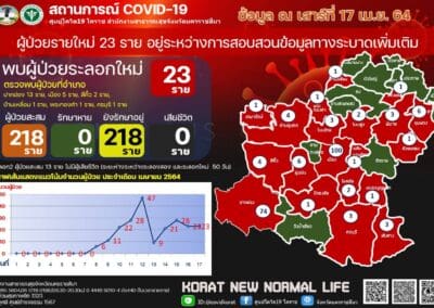 นครราชสีมา – วันนี้ (17 เมษายน 2564) ที่ห้องประชุมสำนักงานการท่องเที่ยวและกีฬาจังหวัดนครราชสีมา นายวิเชียร จันทรโณทัย ผู้ว่าราชการจังหวัดนครราชสีมา พร้อมด้วยนายศักดิ์สิทธิ์ สกุลลิขเรศสีมา รอง ผวจ.นครราชสีมา นายแพทย์ชาญชัย บุญอยู่ รองนายแพทย์สาธารณสุขจังหวัดนครราชสีมา ร่วมกันประชุมคณะกรรมการโรคติดต่อจังหวัดพร้อมแถลงถึงสถานการณ์การแพร่ระบาดของไวรัสโควิด-19 ในพื้นที่จังหวัดนครราชสีมา ซึ่งล่าสุด พบผู้ติดเชื้อเพิ่ม จำนวน 23 ราย มียอดผู้ป่วยสะสมรวม 218 ราย
