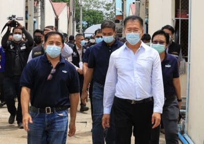 โดยบริษัทซีพีเอฟ (ประเทศไทย) จำกัด (มหาชน) มีลูกจ้าทั้งหมด 6,091 คน เป็นแรงงานต่างด้าวสัญชาติกัมพูชา จำนวน 1,128 คน ส่วนบริษัทคาร์กิลล์ มีทส์ (ไทยแลนด์) จำกัด มีลูกจ้างทั้งหมด 6,880 คน เป็นแรงงานต่างด้าวสัญชาติกัมพูชา 686 คน สัญชาติลาว 146 คน รวม 992 คน โดยพบว่า ห้วงนี้ยังไม่มีการจ้างแรงงานต่างด้าวรายใหม่เข้าทำงานกับสถานประกอบการดังกล่าว จึงได้แนะนำกำชับผู้ประกอบการและแรงงานให้ปฏิบัติตามมาตรการป้องกันและการแพร่ระบาดของโรคโควิด-19 อย่างเคร่งครัด และจัดทำป้ายประชาสัมพันธ์ 2 ภาษา ติดประกาศ ณ ที่ทำงานเเละที่พักของแรงงาน