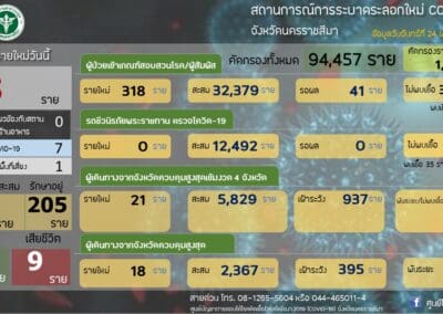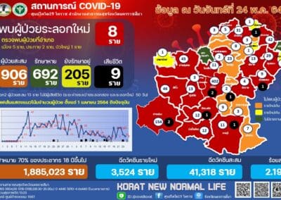 ขณะเดียวกัน วันนี้ (24 พ.ค. 64) ศบค.นครราชสีมา ได้เปิดเผยถึงสถานการณ์ไวรัสโควิด-19 ว่า พบผู้ป่วยใหม่ จำนวน 8 ราย โดยพบในพื้นที่ อ.เมือง 5 ราย อ.ประทาย 2 ราย และ อ.บัวใหญ่ 1 ราย รวมผู้ป่วยสะสม จำนวน 906 ราย รักษาหายแล้ว จำนวน 692 ราย ยังรักษาอยู่ จำนวน 205 ราย เสียชีวิต 9 ราย.