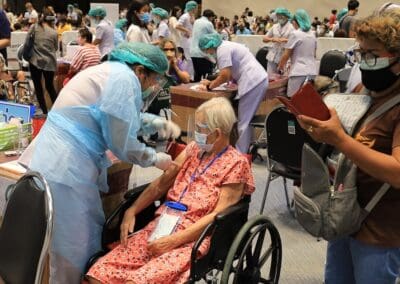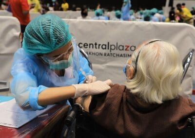 นครราชสีมา – วันนี้ (24 พฤษภาคม 2564) นายวิเชียร จันทรโณทัย ผู้ว่าราชการจังหวัดนครราชสีมา พร้อมด้วยนายแพทย์เกรียงศักดิ์ วัชรนุกูลเกียรติ ผู้อำนวยการโรงพยาบาลมหาราชนครราชสีมา ตรวจเยี่ยมจุดบริการฉีดวัคซีนให้กับประชาชน ที่ศูนย์การค้าเซ็นทรัลพลาซา อ.เมือง จ.นครราชสีมา ซึ่งวันนี้เป็นวันแรกของการฉีดวัคซีนให้กับประชาชนกลุ่มเสี่ยง 2 กลุ่ม ได้แก่กลุ่มผู้สูงอายุ 60 ปี และขึ้น และกลุ่มผู้ป่วย 7 โรคเรือรัง รวมทั้งยังเปิดให้บริการฉีดวัคซีนให้กับประชาชนทั่วไปที่จองคิวผ่านช่องทางต่างๆ โดยบรรยากาศมีประชาชนเดินทางมาฉีดวัคซีนกันเป็นจำนวนมาก